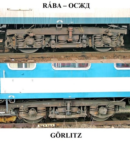 A második kép felső részén a magyar győri kocsik forgóváza látható, alsó részén a Görlitzi, elvileg ez utóbbi modellje van a BTTB és a Tillig y kocsik alatt. A koncepció azonos, a fő méretek egyeznek (forgóvázkeret, tengelytáv, kerékátmérő), mert ezt egységesítették (ha jól tudom erről szólt az OSZZSD, ha valamit pontatlanul írtam elnézést, nem vagyok vasutas, csak lelkes amatőr)