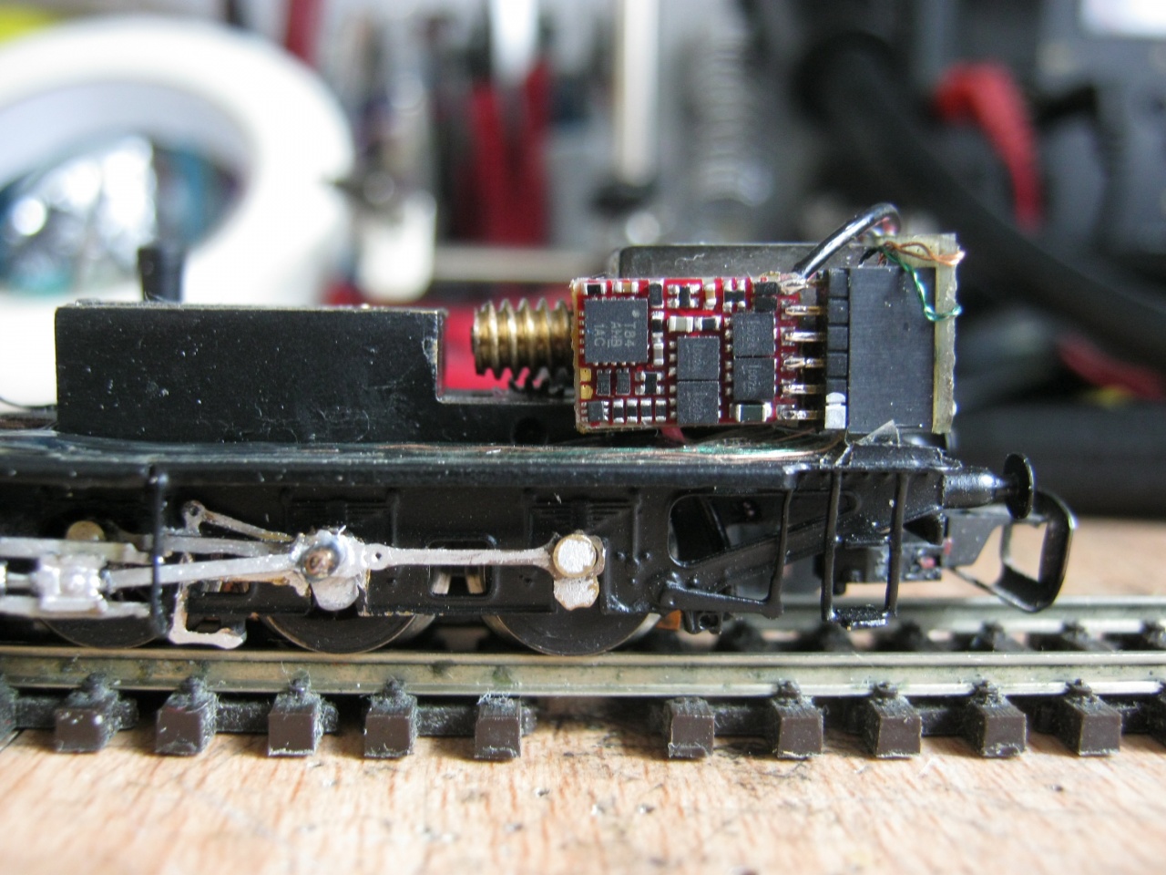 Első képen a kis szépség, teljes pompájában. Egy csavart kell óvatosan kitekerni a gőzdóm tetjén, és szépen lejön az alvázról a mozdonyház. Második képen a vakdugó helyére tett Tran DCX76D/N dekóder. Harmadik képen már működik is, de mivel csak fénykép, így csak azzal tudom demonstrálni a működés, hogy fel van kapcsolva a világítás.