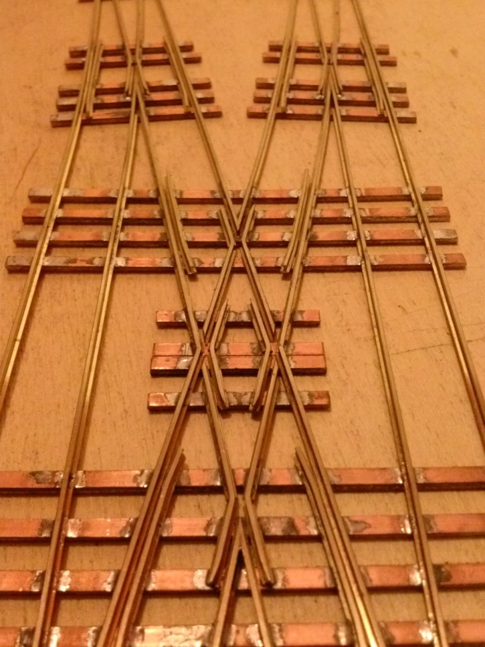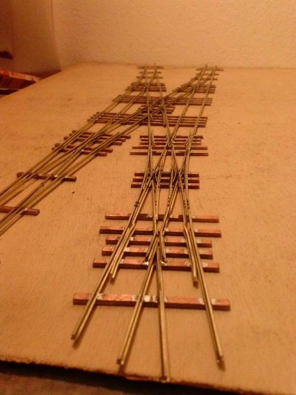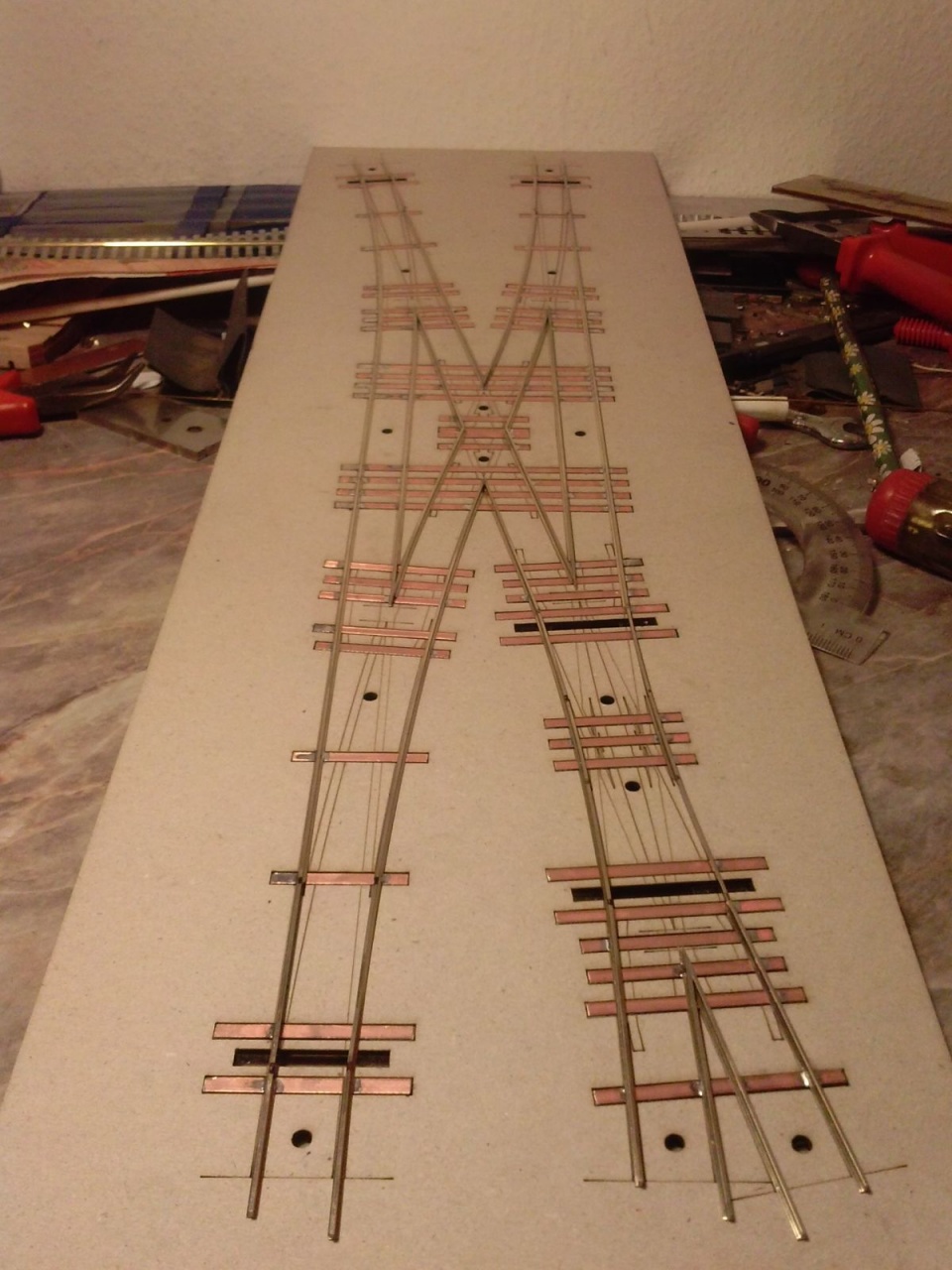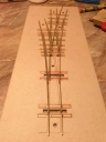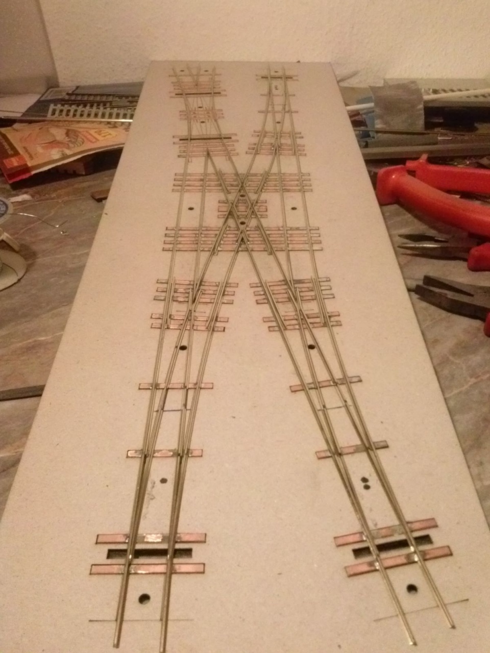 Elkezdtem a H0m hózentrógert. Egy angolváltó, és egy kifelé forduló kitérő van rajta. A vágánytengely-távolság 60mm. Megnehezíti az építést, hogy átmenőköríves kitérők alkotják, ezért a belső rész nem csak egyenes háromszögekből áll. |