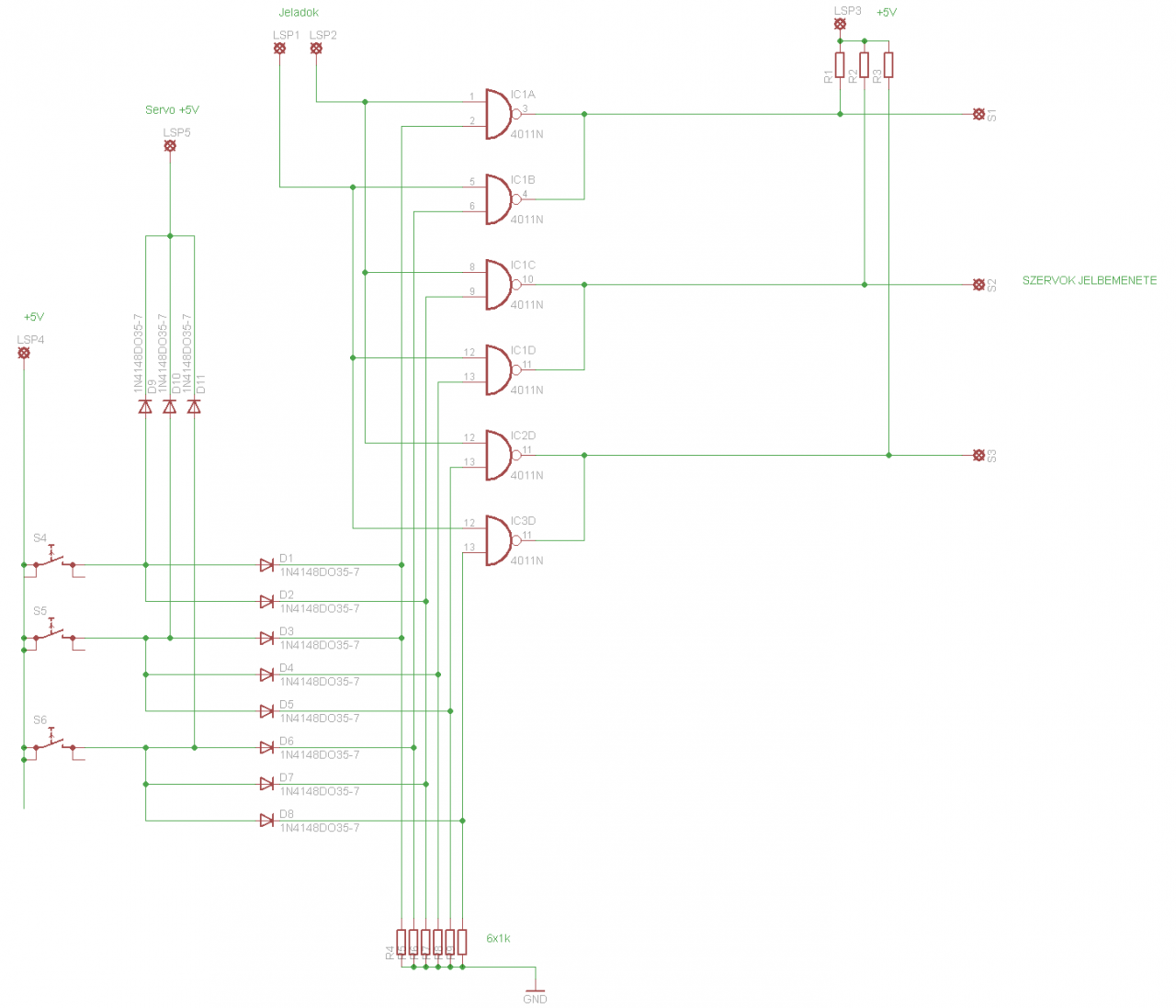 Közben gondolkodok, hogy hogyan lehetne megoldani a feladatot, mert a piltdownman kolléga felfedezése, mármint, hogy +5V-ra kell felhuzni a szervok bemenetét, alapból megváltoztatja a szitut, és az optokopplerek nem fogják tudni kezelni az impulzusok elosztását. (Azok eredetileg egy OR kaput alkottak, de igy már nem. Azaz lehet, hogy forditani kell a müködésen, azaz optokkal nem a jelet kell vezetni, hanem kizárni, de ez nem olyan egyszerü....