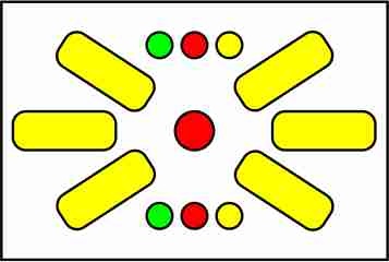 Nemrégen láttam valahol és ez alapján megterveztem a saját domino kockámat. Ezt aránylag könnyü kimarni egy müanyaglapból. A szines felületek mind lyukak, amiket majd a fedöfólia az igény szerint fog takarni. Éppen most keresek valami fekete vagy szürke müanyaglapot amiböl nekifogok majd marni (kb 2-3mm vastag.). Plexiböl nem jo mert azt átvilágitják a LED-ek. A 3 kisebb lyuk a jelzöknek lett szánva , a nagy piros a közepén a nyomogomb, a sárga hosszukás lyukak meg a pályát modellezik.