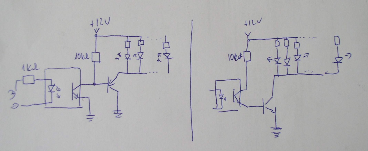 Mellékeltem két kapcs rajzot. Mindkettő abban az esetben kapcsolja be a tranzisztorra kötött sok-sok led-et, amikor az optocsatoló működik.