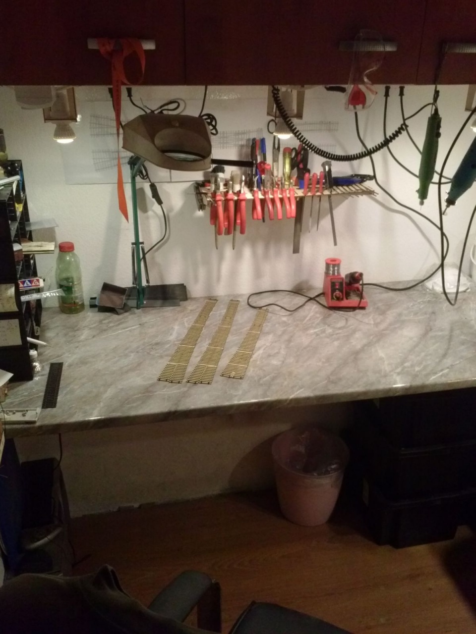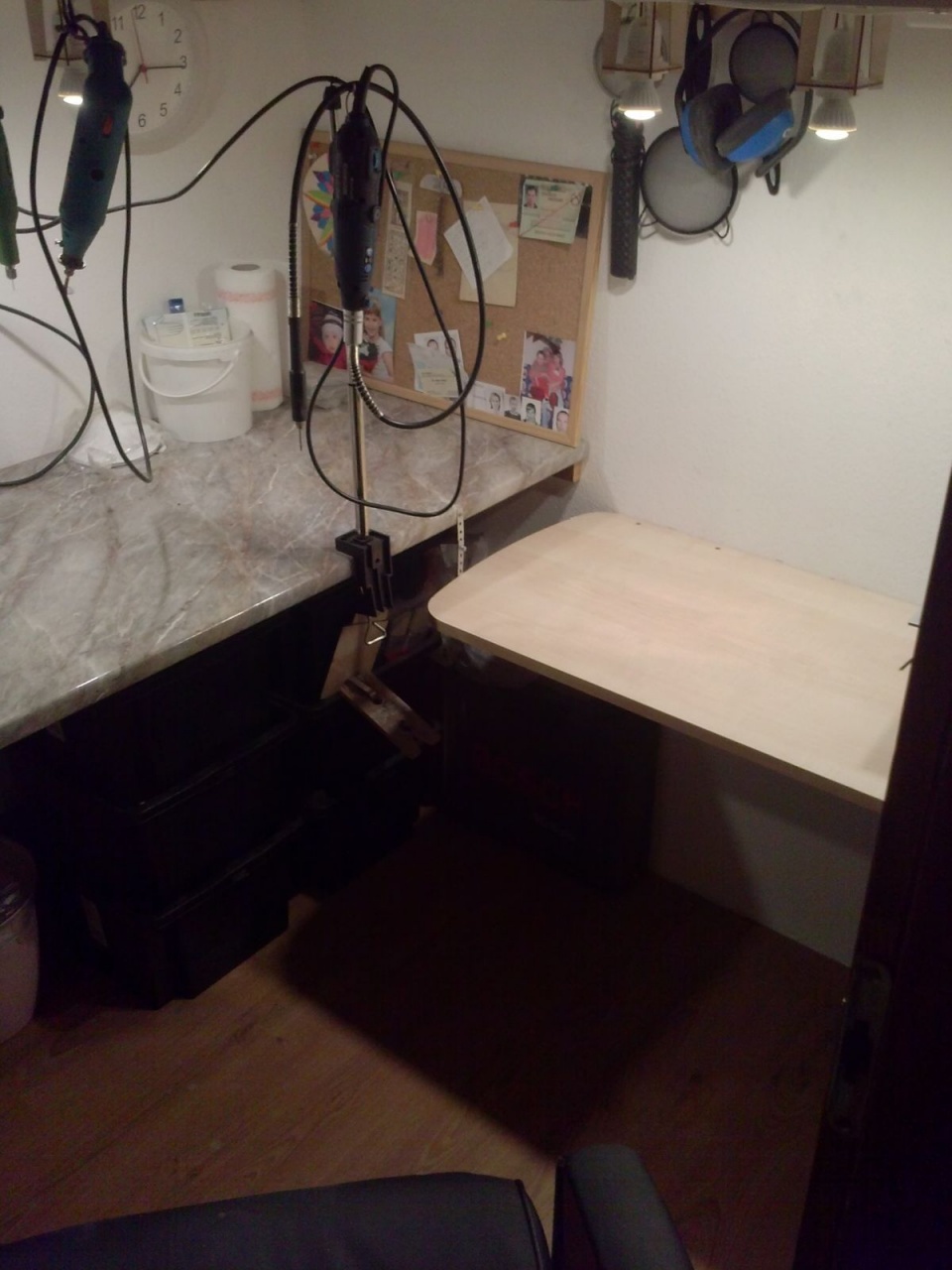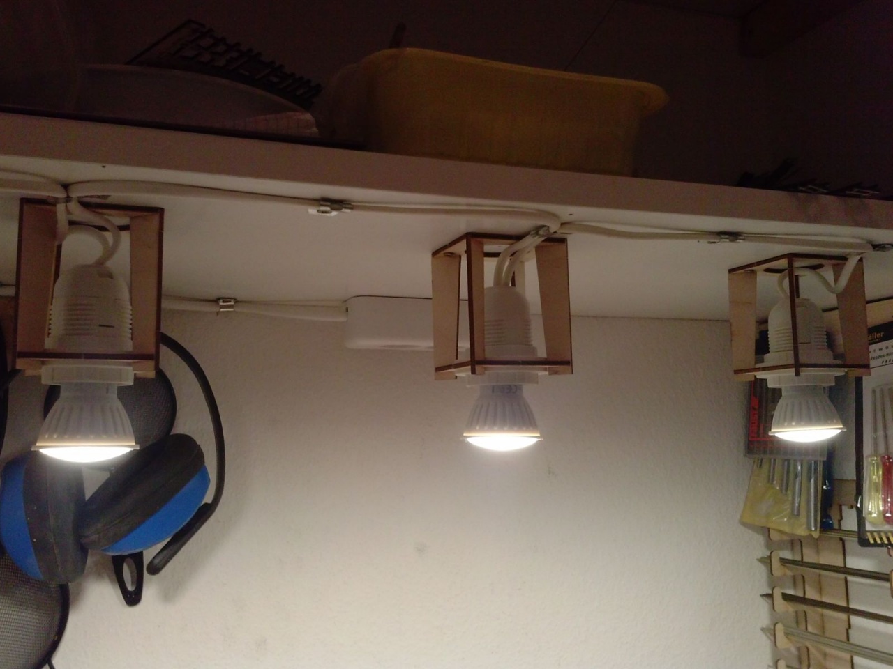 Csináltam síntartót, nyáktartót, szerszámtartót, még egy asztalt, ledes világítást, és 12 db asztal feletti konnektort, mert eddig csak 4 darab volt az asztal alatt. Azt hiszem, így már könnyebben tudnak dolgozni a droidok!  |