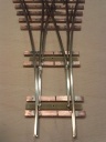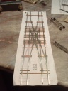 Ez a talpfa egy ROCO H0e kitérő alapján készült. Egy NYÁK lemezre lett felrajzolva a talpfa mintázata, majd kireszelve. A sínek nem forrasztva vannak, hanem a sínkötések helyén a talpfa meg lett furkálva, és tűzőgép kapoccsal van a sín felfogatva. Én is elkezdtem egy hasonlót, persze lézervágott talpfával, de még nem jutottam a végére. |