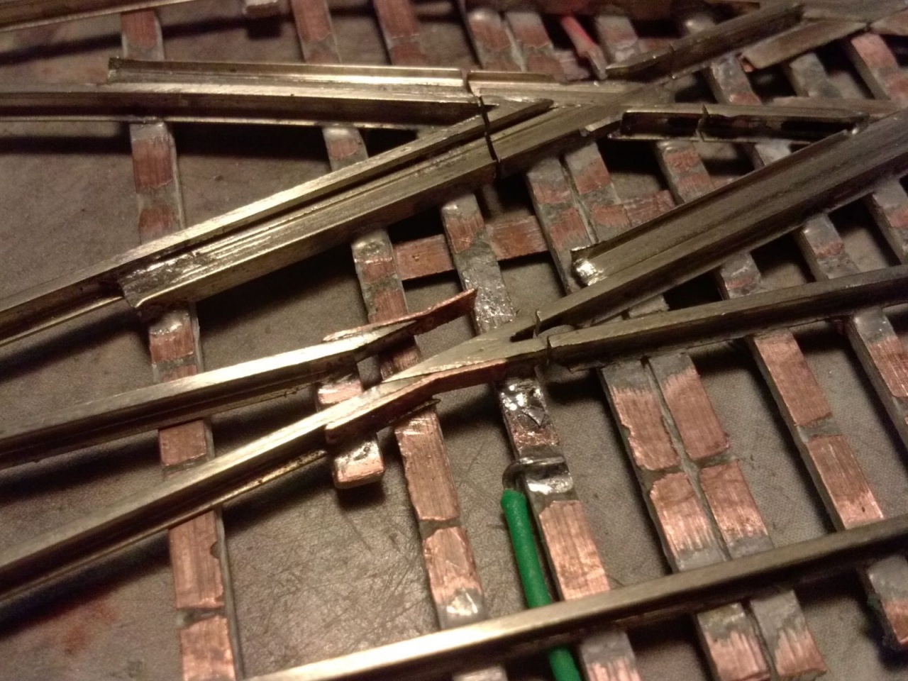 Kicsit optimista kijelentés volt, mivel szerencsére volt annyi eszem, hogy elvittem kipróbálni, mielőtt befejezem volna. Persze ezek a nyüves széles kerekek a mozgó részt rövidre zárták a tősínekkel. Tehát a középső részt összekötöttem egy nyáklappal, és a két belső sínt összekötő réz lapot kettévágtam a szegecs mellett. A csúcssínről megtáplált közbenső sínek áramellátása sem volt acélos, ezért azt is megtápláltam vékony rugóbronz csíkokkal. Azután eszembe jutott, hogy ezen a cuccon 40-50 éves mozdonyok futnak majd, ezért a mozgó szívről megpróbáltam megtáplálni az átszelés szívdarabjait is, de nem volt a szívnél elég stabil a kontakt, ezért kis réz lemezzel itt is rásegítettem az érintkezésre. Az látszik a képeken, hogy a végén az üzembiztonságra törekedtem, nem az esztétikára, mivel amúgy is olyan ronda, hogy az anyja sem találná szépnek, ha lenne neki!  |