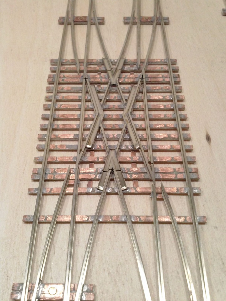 Kicsit optimista kijelentés volt, mivel szerencsére volt annyi eszem, hogy elvittem kipróbálni, mielőtt befejezem volna. Persze ezek a nyüves széles kerekek a mozgó részt rövidre zárták a tősínekkel. Tehát a középső részt összekötöttem egy nyáklappal, és a két belső sínt összekötő réz lapot kettévágtam a szegecs mellett. A csúcssínről megtáplált közbenső sínek áramellátása sem volt acélos, ezért azt is megtápláltam vékony rugóbronz csíkokkal. Azután eszembe jutott, hogy ezen a cuccon 40-50 éves mozdonyok futnak majd, ezért a mozgó szívről megpróbáltam megtáplálni az átszelés szívdarabjait is, de nem volt a szívnél elég stabil a kontakt, ezért kis réz lemezzel itt is rásegítettem az érintkezésre. Az látszik a képeken, hogy a végén az üzembiztonságra törekedtem, nem az esztétikára, mivel amúgy is olyan ronda, hogy az anyja sem találná szépnek, ha lenne neki!  |