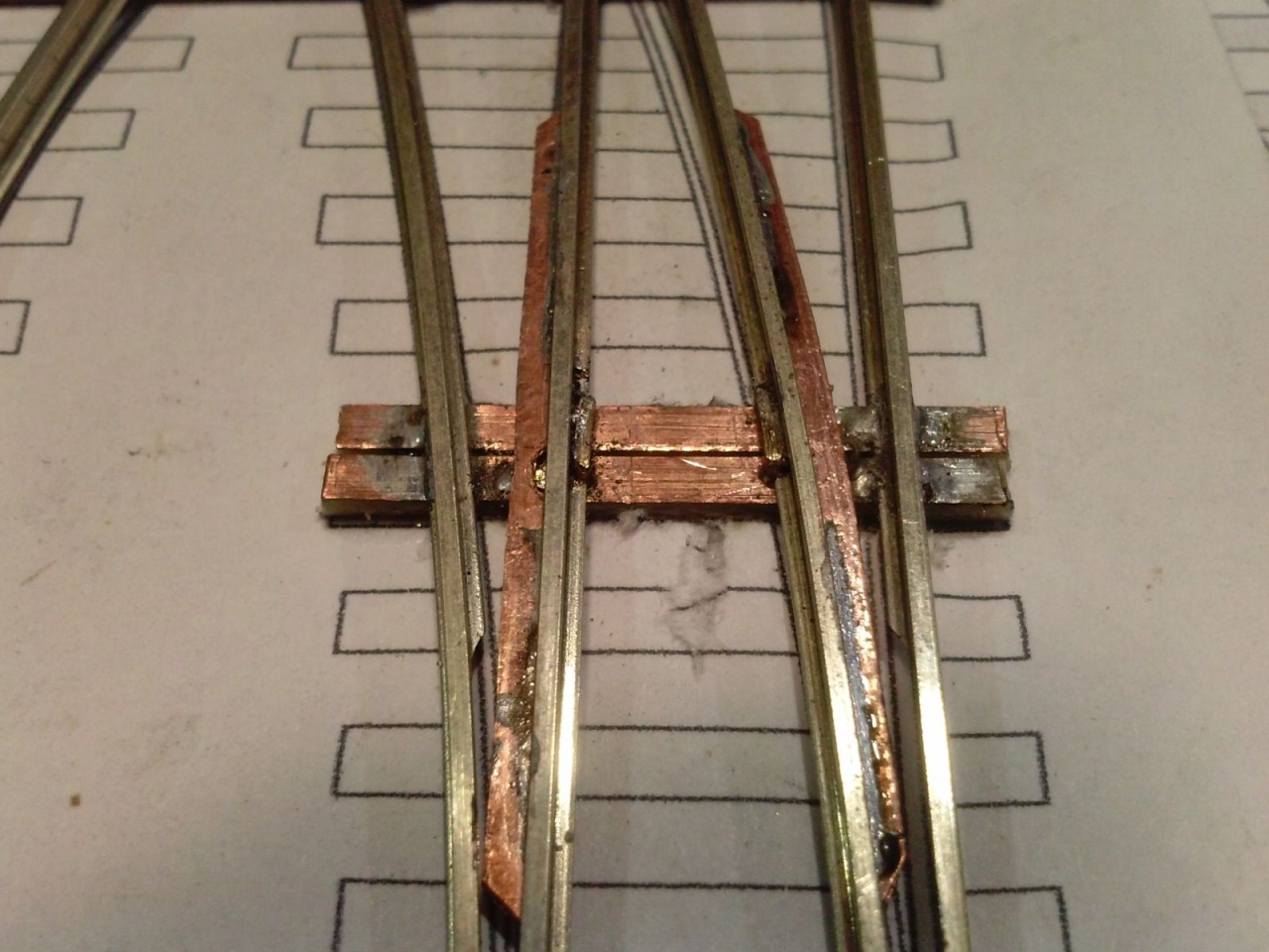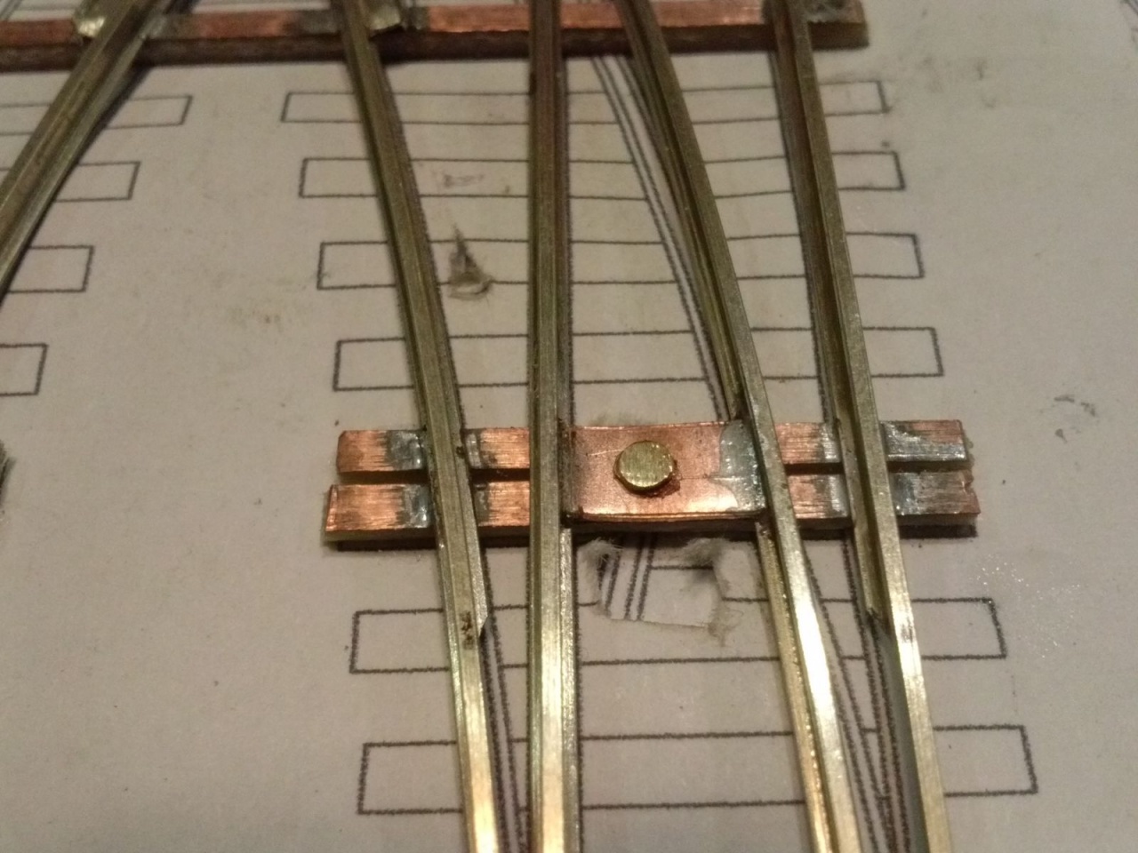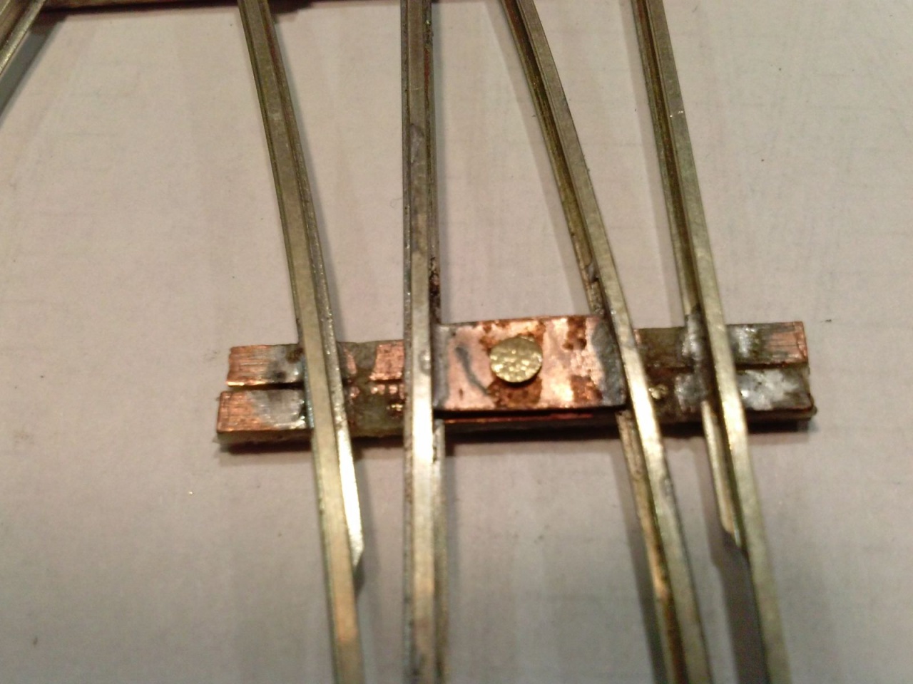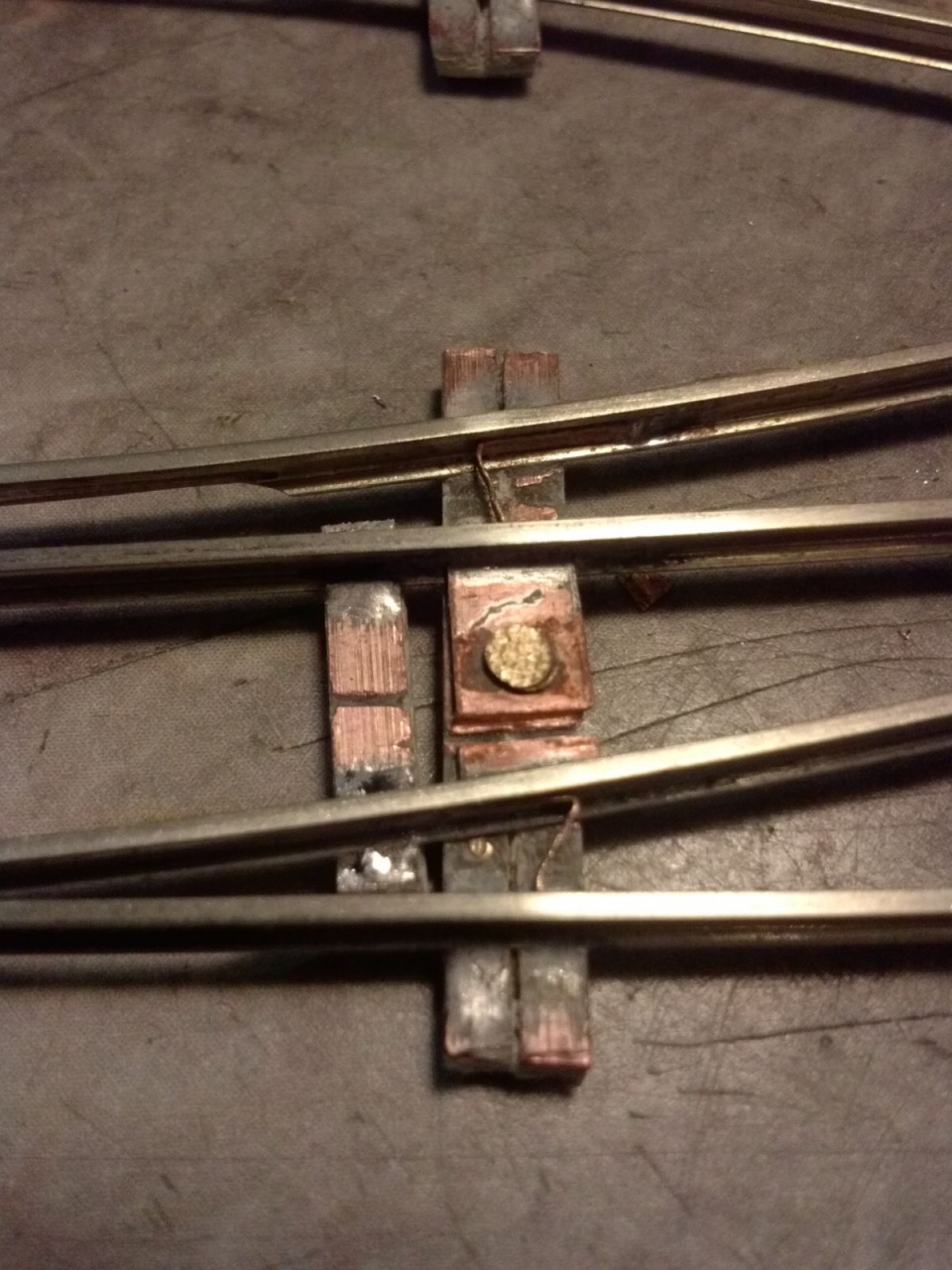 Kicsit optimista kijelentés volt, mivel szerencsére volt annyi eszem, hogy elvittem kipróbálni, mielőtt befejezem volna. Persze ezek a nyüves széles kerekek a mozgó részt rövidre zárták a tősínekkel. Tehát a középső részt összekötöttem egy nyáklappal, és a két belső sínt összekötő réz lapot kettévágtam a szegecs mellett. A csúcssínről megtáplált közbenső sínek áramellátása sem volt acélos, ezért azt is megtápláltam vékony rugóbronz csíkokkal. Azután eszembe jutott, hogy ezen a cuccon 40-50 éves mozdonyok futnak majd, ezért a mozgó szívről megpróbáltam megtáplálni az átszelés szívdarabjait is, de nem volt a szívnél elég stabil a kontakt, ezért kis réz lemezzel itt is rásegítettem az érintkezésre. Az látszik a képeken, hogy a végén az üzembiztonságra törekedtem, nem az esztétikára, mivel amúgy is olyan ronda, hogy az anyja sem találná szépnek, ha lenne neki!  |