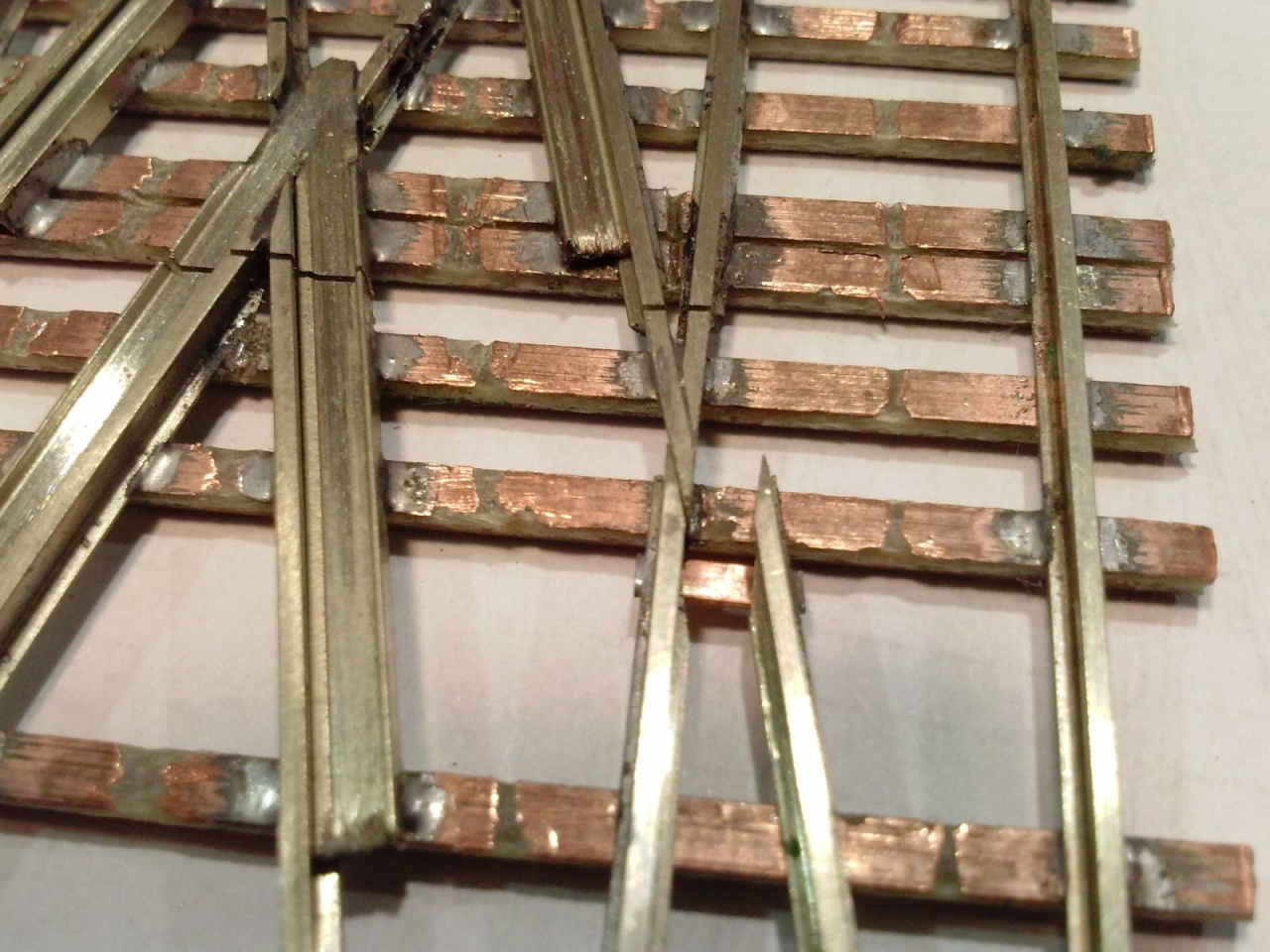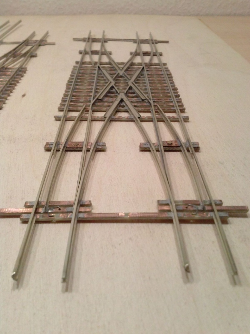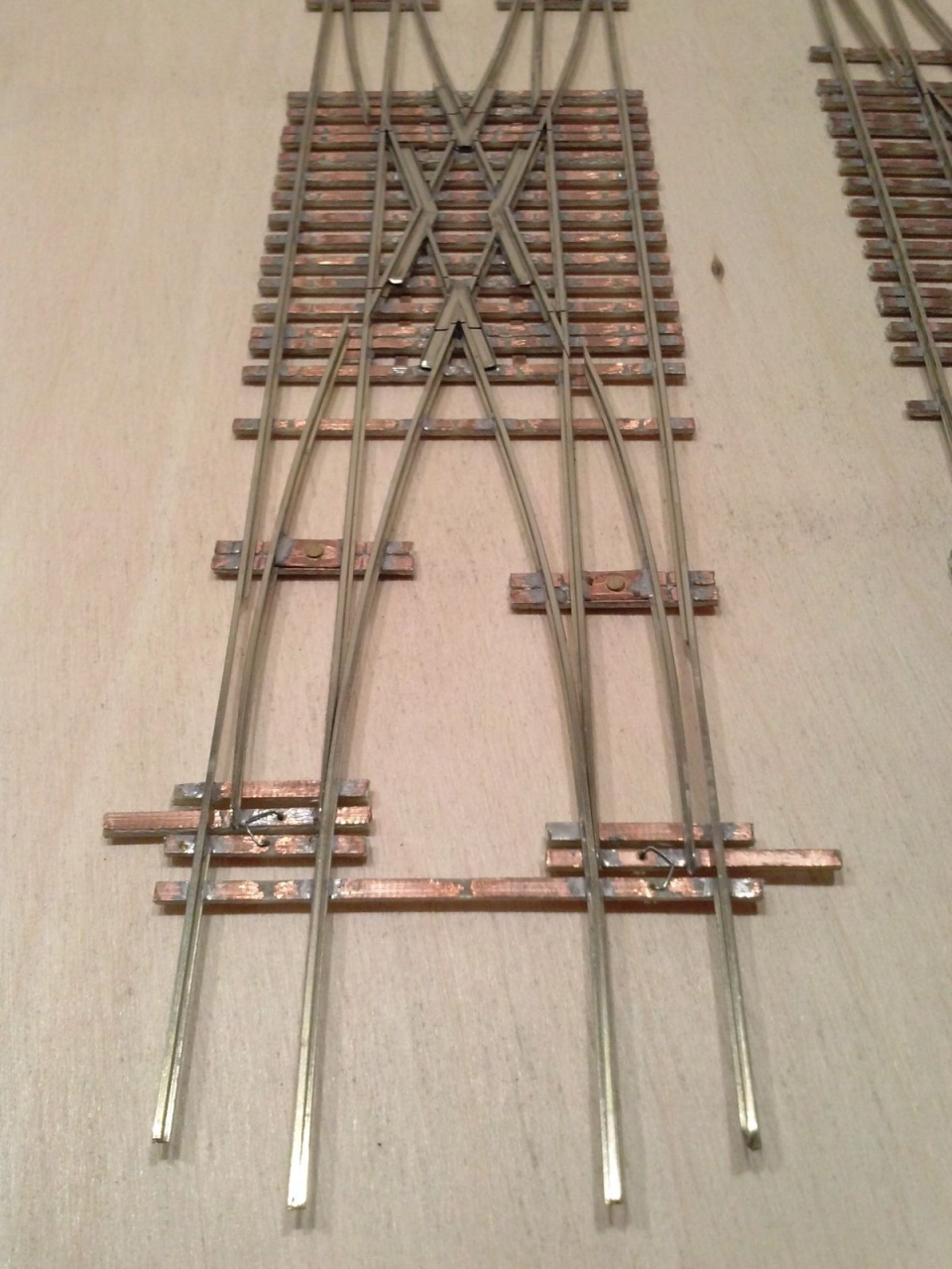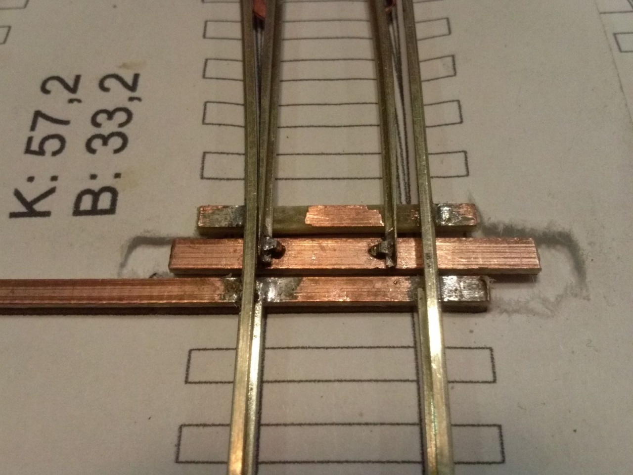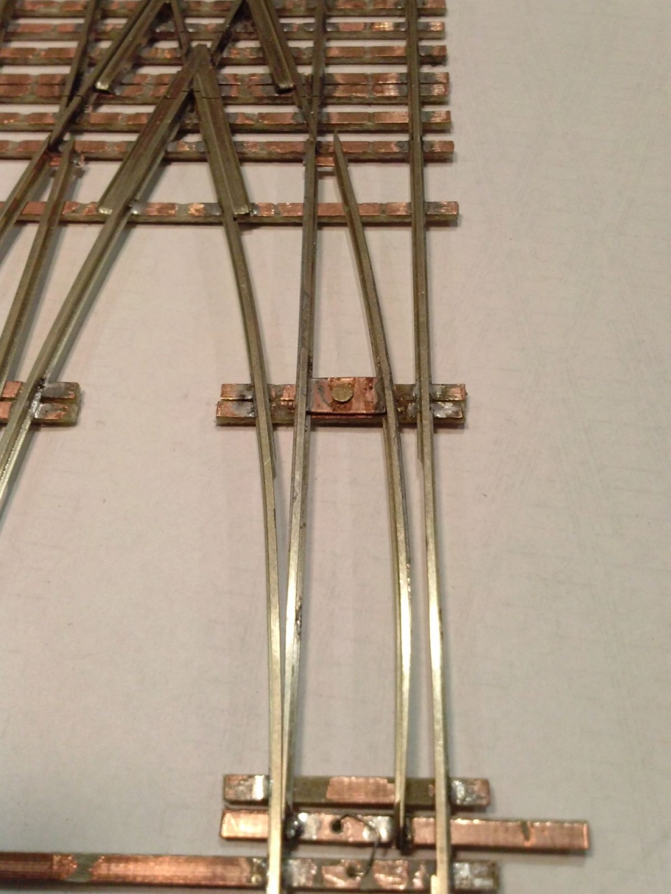 Kicsit optimista kijelentés volt, mivel szerencsére volt annyi eszem, hogy elvittem kipróbálni, mielőtt befejezem volna. Persze ezek a nyüves széles kerekek a mozgó részt rövidre zárták a tősínekkel. Tehát a középső részt összekötöttem egy nyáklappal, és a két belső sínt összekötő réz lapot kettévágtam a szegecs mellett. A csúcssínről megtáplált közbenső sínek áramellátása sem volt acélos, ezért azt is megtápláltam vékony rugóbronz csíkokkal. Azután eszembe jutott, hogy ezen a cuccon 40-50 éves mozdonyok futnak majd, ezért a mozgó szívről megpróbáltam megtáplálni az átszelés szívdarabjait is, de nem volt a szívnél elég stabil a kontakt, ezért kis réz lemezzel itt is rásegítettem az érintkezésre. Az látszik a képeken, hogy a végén az üzembiztonságra törekedtem, nem az esztétikára, mivel amúgy is olyan ronda, hogy az anyja sem találná szépnek, ha lenne neki!  |