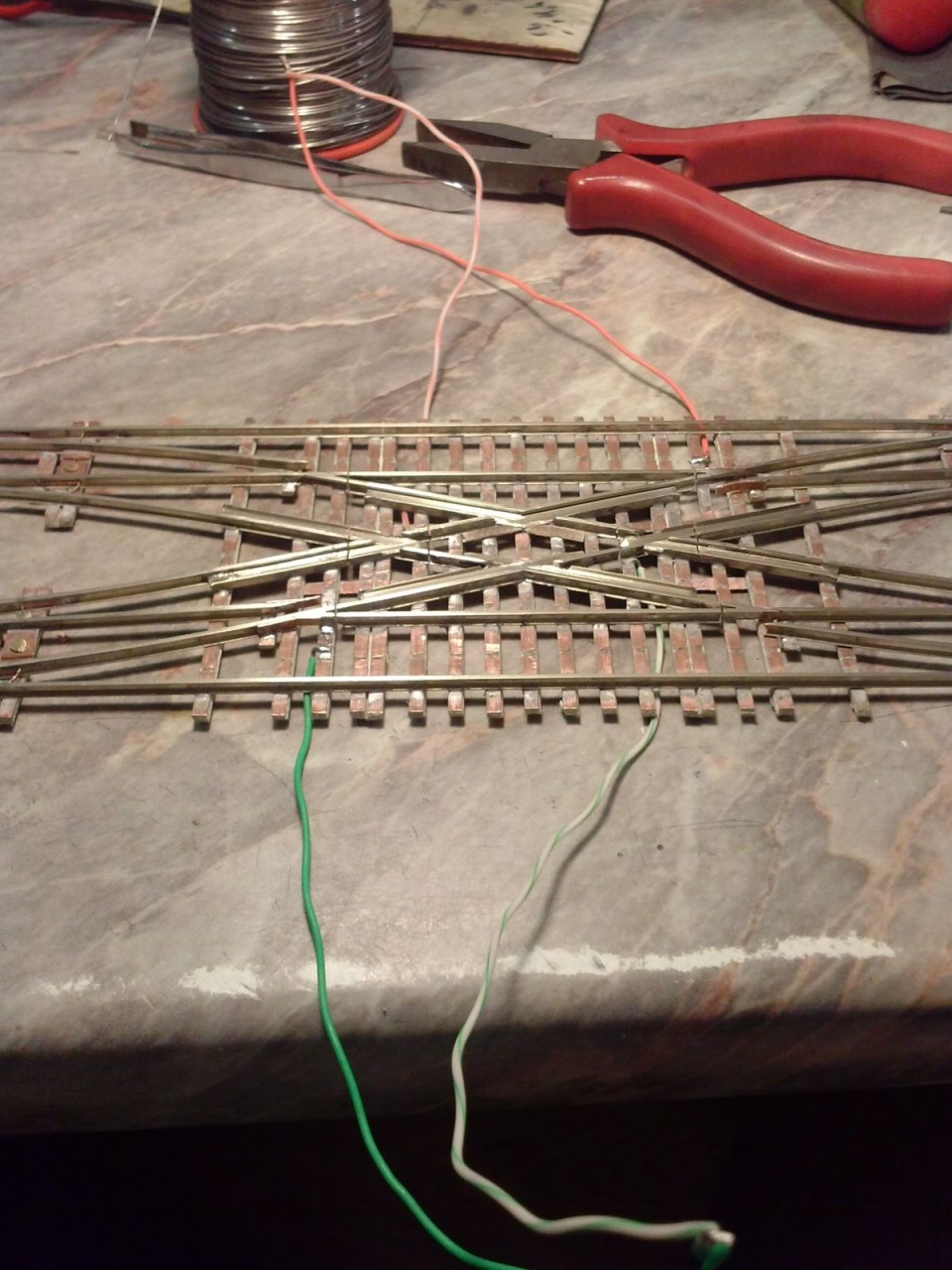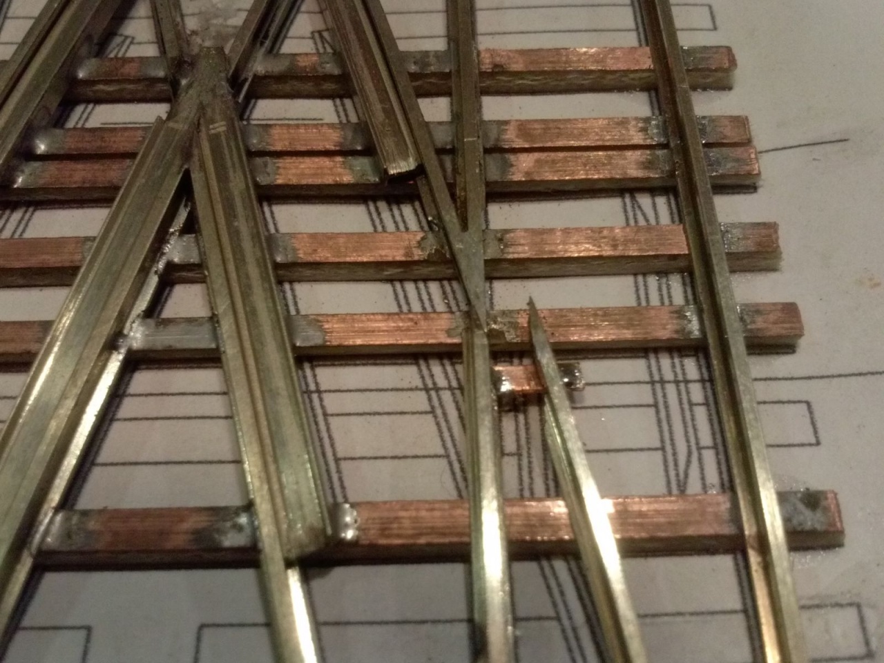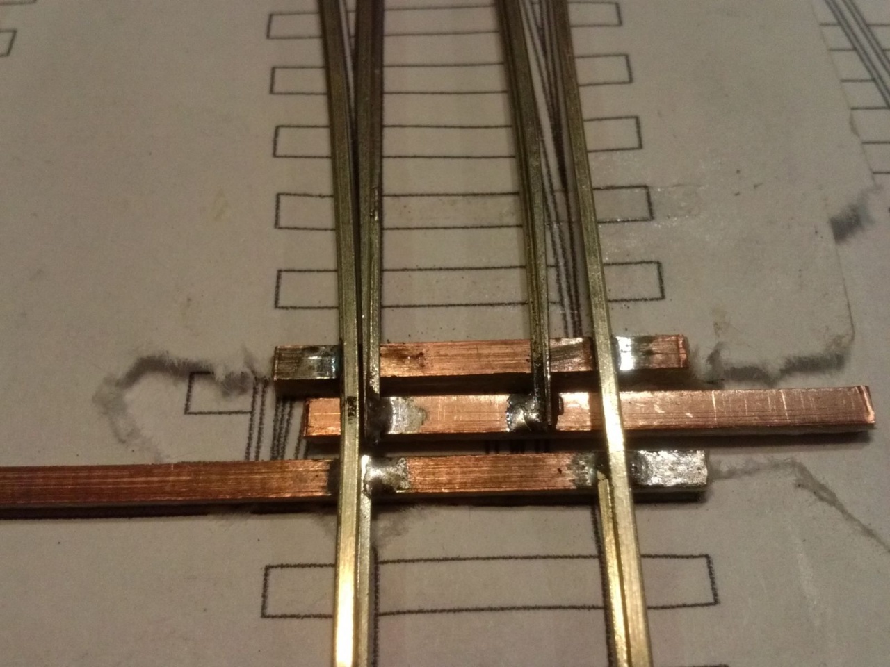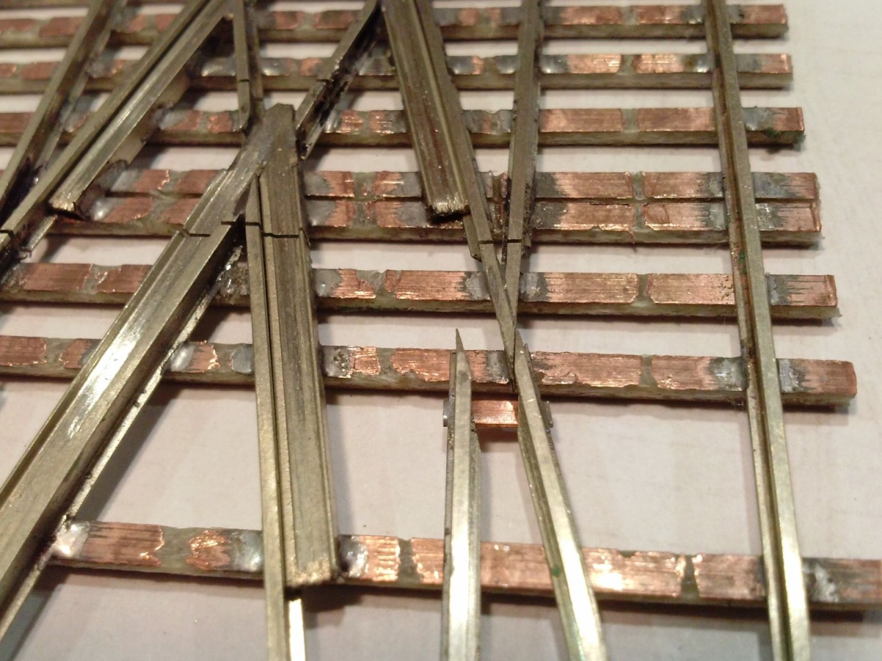 Kicsit optimista kijelentés volt, mivel szerencsére volt annyi eszem, hogy elvittem kipróbálni, mielőtt befejezem volna. Persze ezek a nyüves széles kerekek a mozgó részt rövidre zárták a tősínekkel. Tehát a középső részt összekötöttem egy nyáklappal, és a két belső sínt összekötő réz lapot kettévágtam a szegecs mellett. A csúcssínről megtáplált közbenső sínek áramellátása sem volt acélos, ezért azt is megtápláltam vékony rugóbronz csíkokkal. Azután eszembe jutott, hogy ezen a cuccon 40-50 éves mozdonyok futnak majd, ezért a mozgó szívről megpróbáltam megtáplálni az átszelés szívdarabjait is, de nem volt a szívnél elég stabil a kontakt, ezért kis réz lemezzel itt is rásegítettem az érintkezésre. Az látszik a képeken, hogy a végén az üzembiztonságra törekedtem, nem az esztétikára, mivel amúgy is olyan ronda, hogy az anyja sem találná szépnek, ha lenne neki!  |