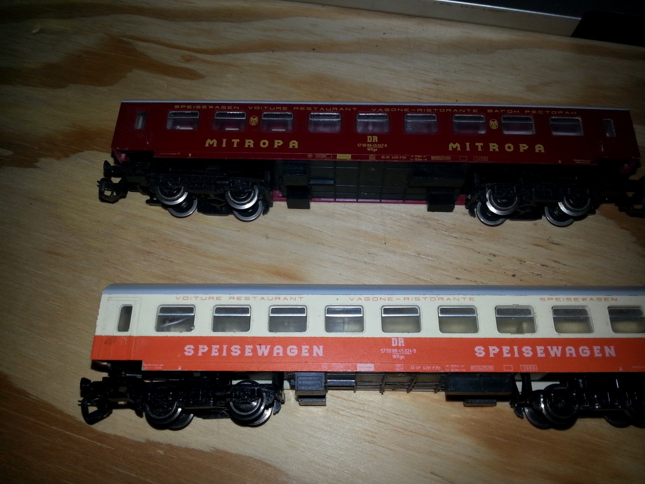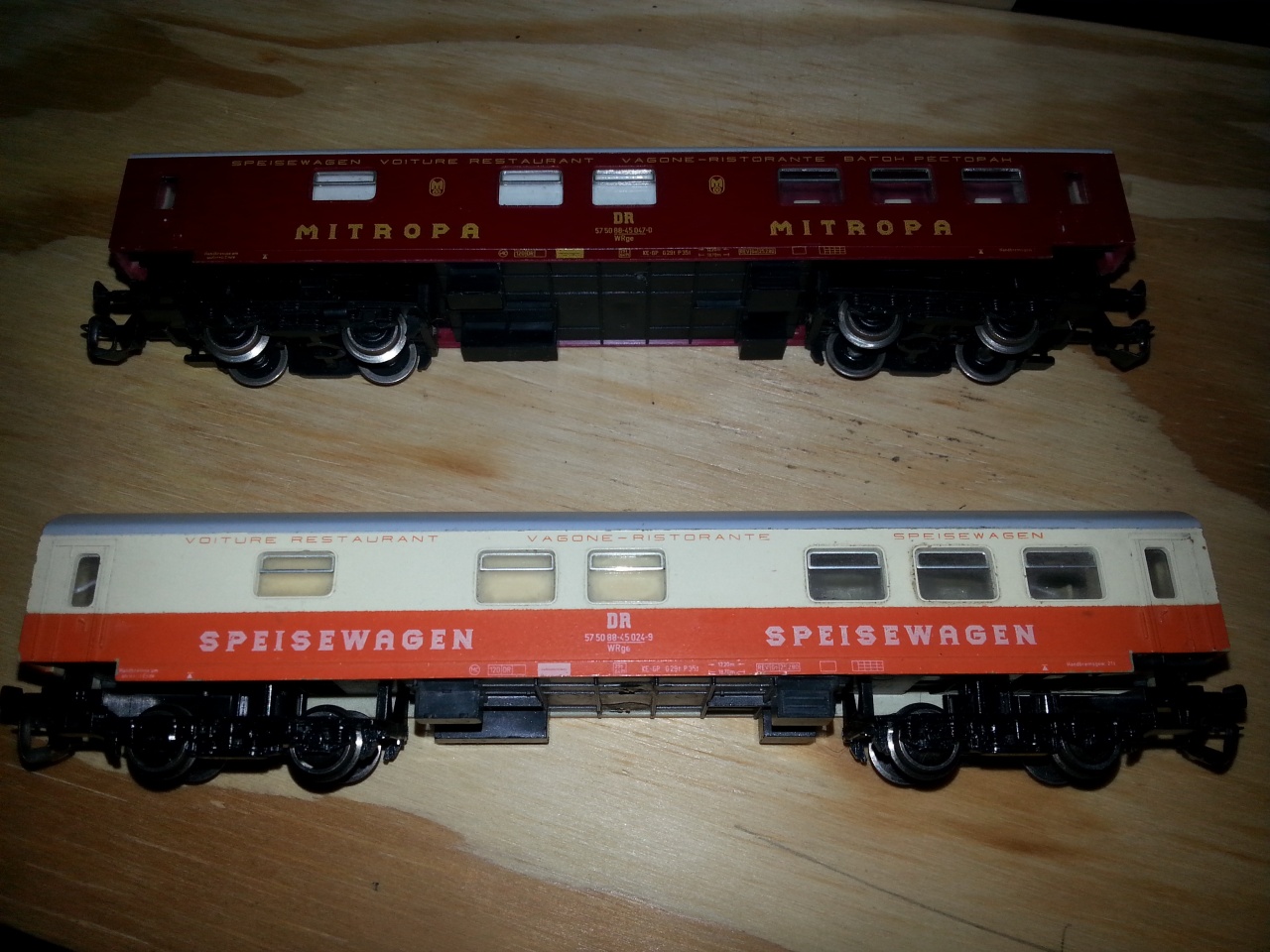 Ezek nagyon szép kis Reko kocsik. Biztos van olyan topiktárs, aki jobban ért a DR vonatösszeállításaihoz, inkább az ő véleményük legyen a mérvadó. Az biztos, hogy az alsó kocsi a Städteexpress étkezője, sőt ehhez középajtós Halbertstadti is van/volt akár szettben is. Nem vagyok benne biztos, de talán a Modist adott ki ehhez oldalfolyosóst is.