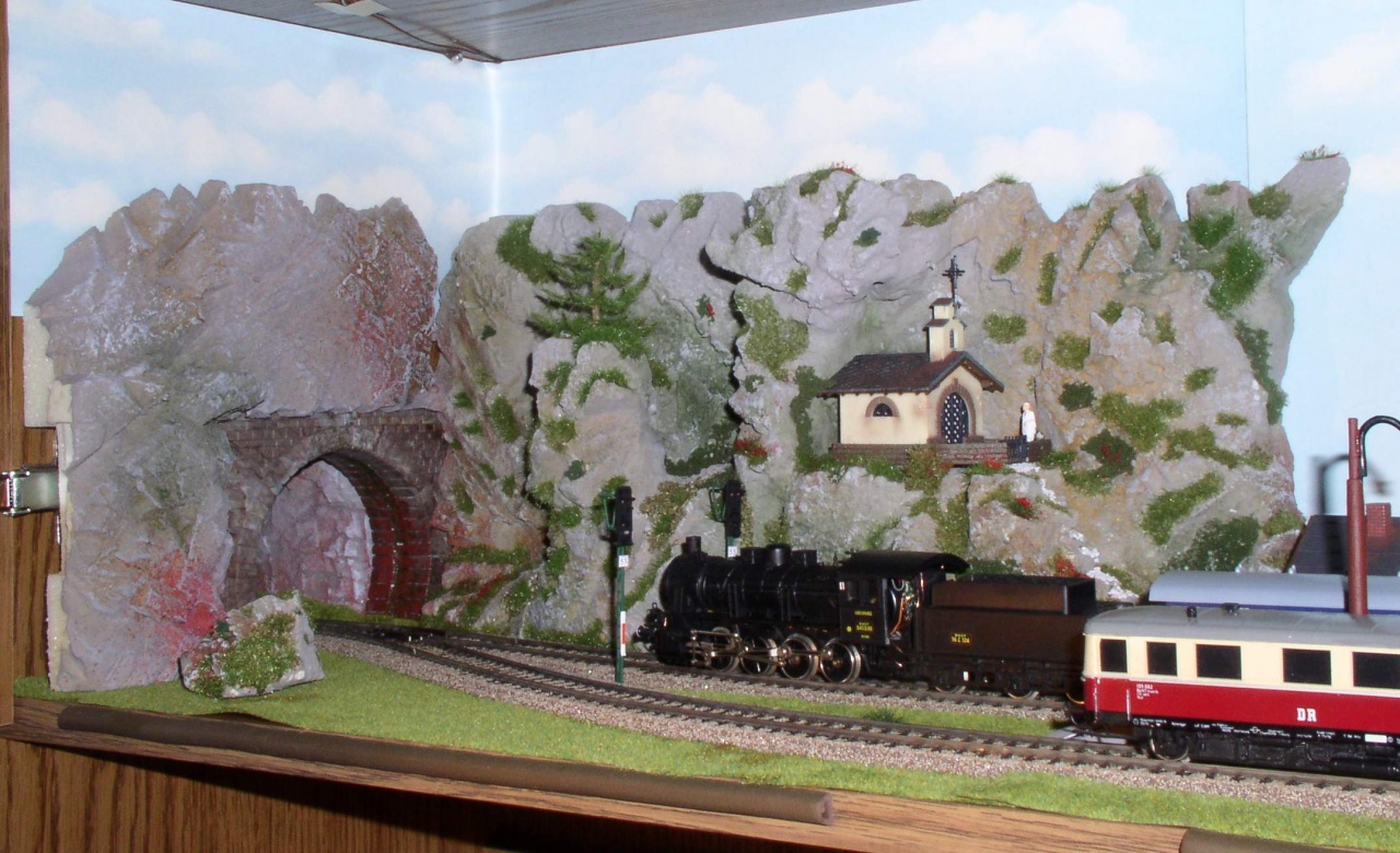 Egész szépen alakul! Ha elfogadsz egy "tanácsot" (innen, a pálya széléről): A fűpapírt ragaszd le, mert a széle felpöndörödik, és eléggé illúzió-romboló hatású. Amúgy kimondottan tetszetős. Főleg a fák "tuningja" és a kápolna.  |