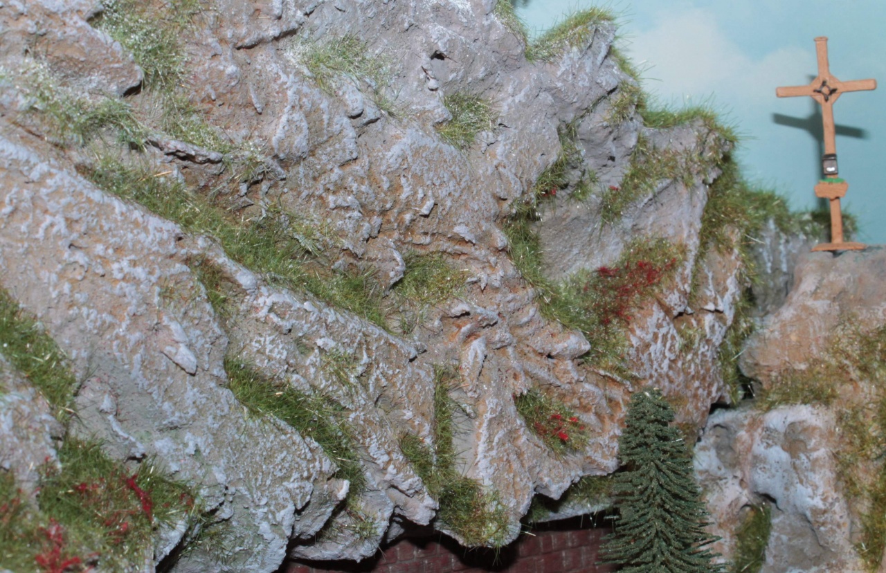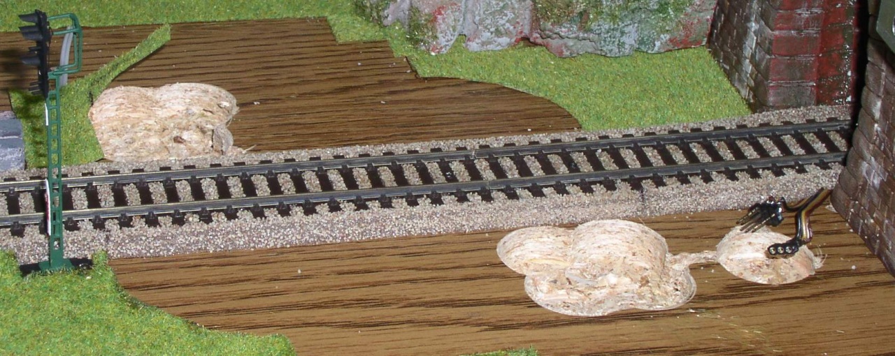 -Alagút bejárata fülé szúnyoghálóból lesz majd sziklavédő. Nekem a túlzott egyenessége nem tetszik a szikláknak ott, erre lesz majd a háló, ami megtöri ezt az egyenességet - amikor kifaragtam a lapokat és festetlenül odapróbáltam, nem tűnt fel...