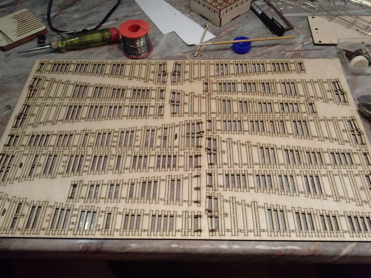 Ha nem volnék lusta, lehetne simán a nyomtatott áramkörökhöz alkalmazott technológiával a "talpfákat" előkészíteni ez után a sínt már csak a talpfa kimaratott sínszékeihez forrasztani.még a papír sem biztos hogy kellene alá, max a talpfaosztáshoz. ( így még a talpfákat egyedileg feliratozni is lehetne.) |