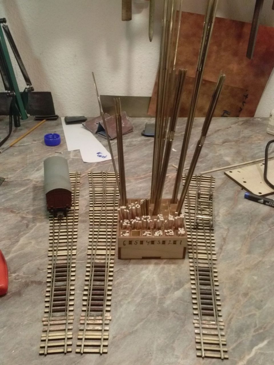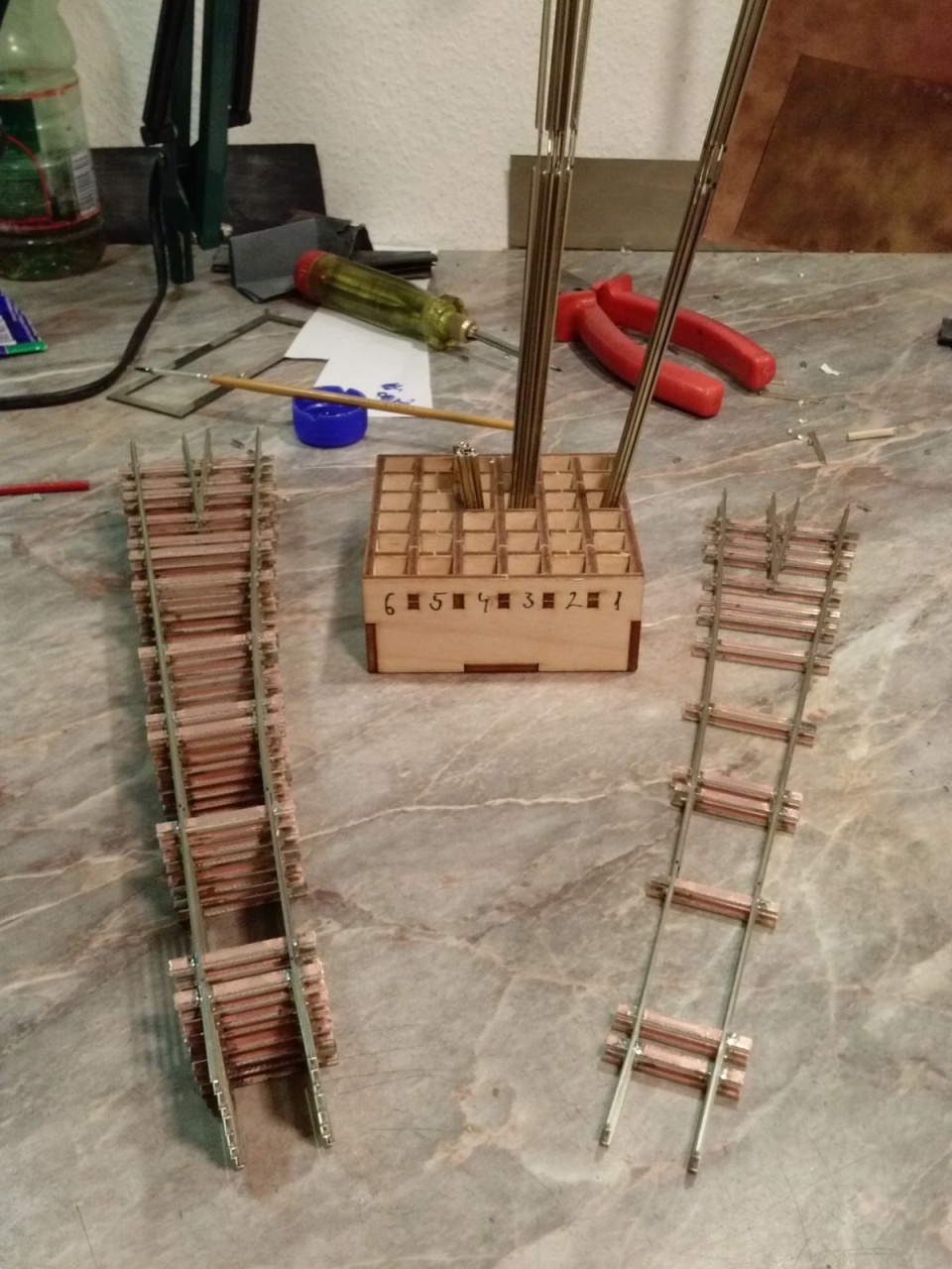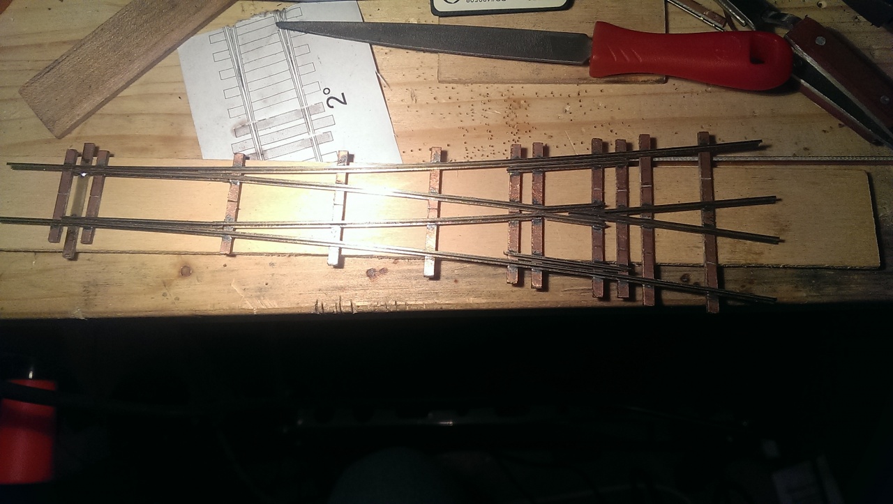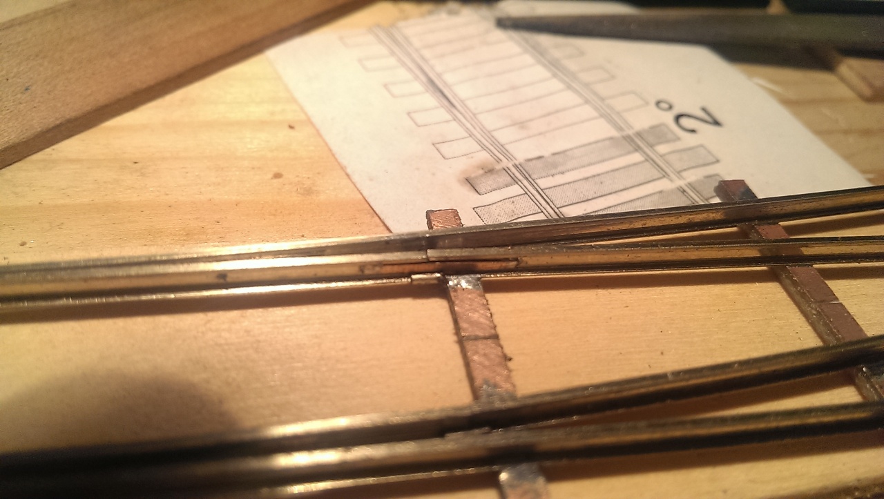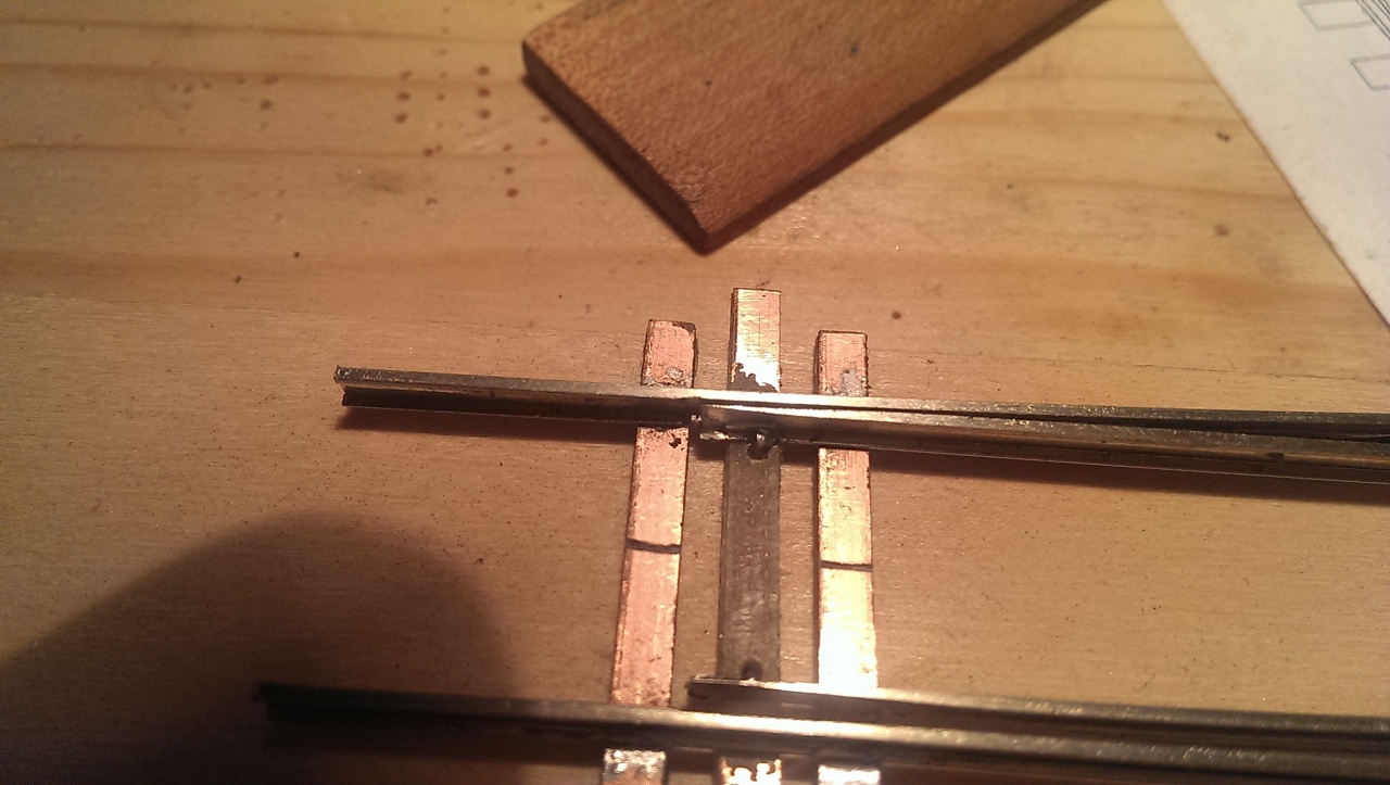 Úgy nézem szépen megcsináltad a csapos feladatot.Az angol csak annyival nehezebb, hogy sokkal több mindent kell pontosan csinálni. Különösen a középrésznél minden távolság betartandó.Én az itteni képek alapján építettem egy saját geometriájút.Annyit változtatam, mivel úgyis szervóval lesz állítva, a középső csúcssíneket nem csaposra készítettem , hanem lereszeltem az oldalukat,és fixre forasztottam a közepénél. Így rugalmasan nekinyomódnak a középső tősínekhez. Állításnál nem a csúcssínt nyomon a tősínhez, mert így nehéz volt beállítani hézagokat, hanem a másik oldali csúcssínt húzza el a tősíntől az állító rúdba reszelt horony.