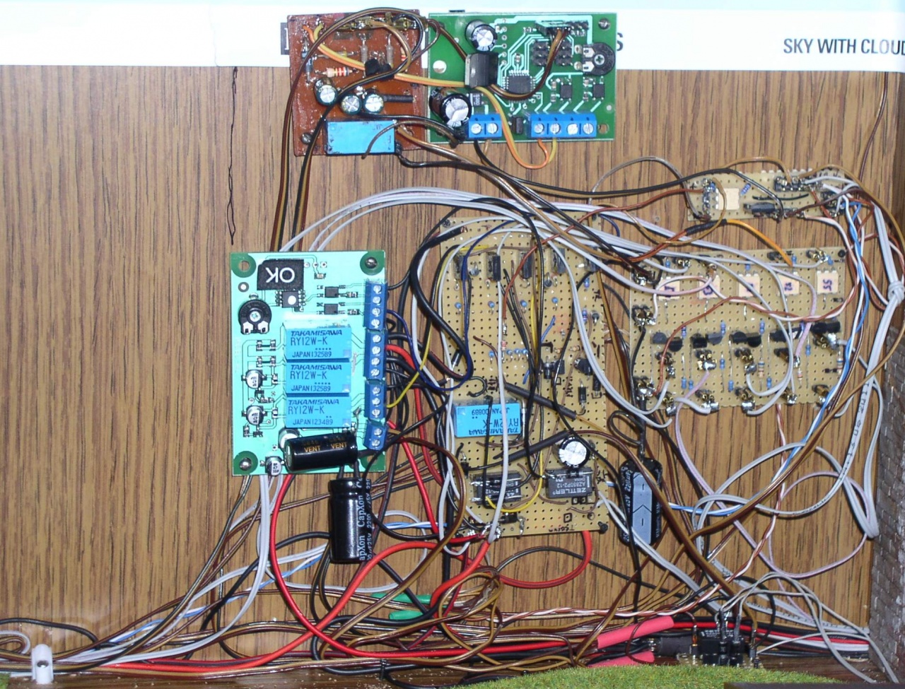 A vitrinvonat vezérlőközpontja így - a sorompó vezérléssel - elérte legkuszább állapotát. Ennél több dolog nem lesz benne.