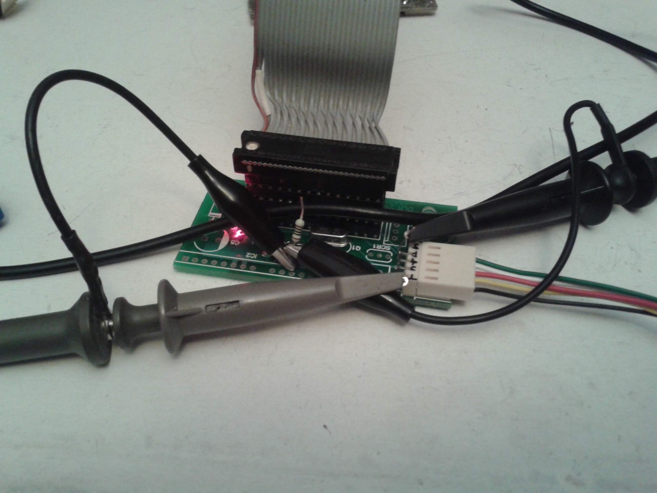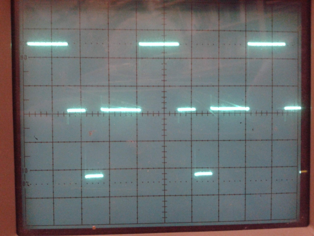 Húsz új asm sort biggyesztettem egy meglévő projectbe, kerestem egy üres panelt, debuggert váltottam és három drótot is forrasztottam a mérőfejekhez. A kimenő jel a szkóp „invert” + „add” funkciójával van előállítva a két pwm jelből.