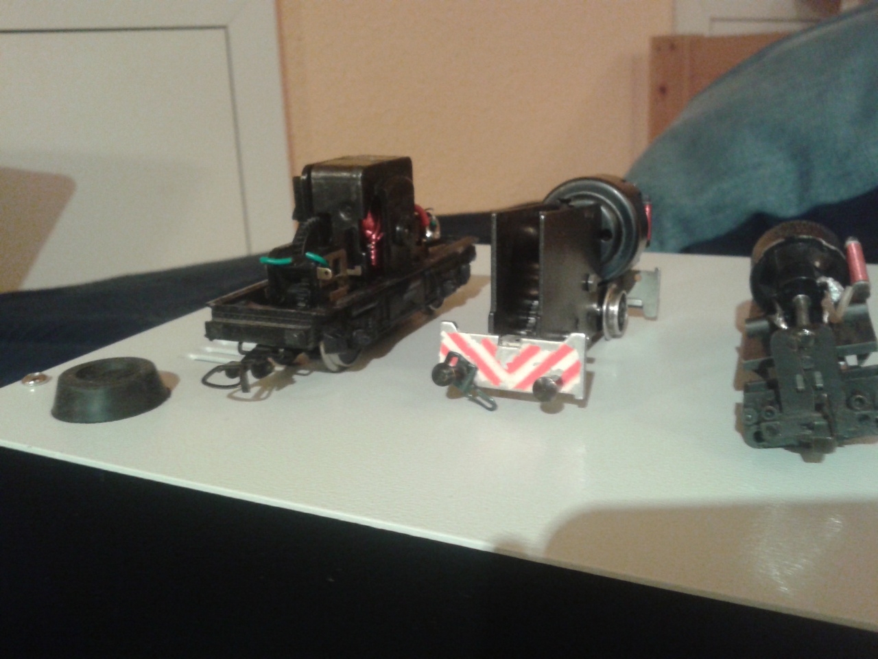Tehát ismerőstő kaptam egy doboz vasútmodellezős dolgot, sajnos elég rossz állapotban: sínt, váltókat, 2 régi személy, illetve 2db a valóságban az EAS kocsiknak megfelelő kocsit. Ezekkel kisseb bajok vannak: hiányzanak az ütközők, kerekek kiesnek. Itt az első kérdés: hol lehet ilyet szerezni? (mármint ütközőt) De a nagyobbik baj: nincs ép mozdony. Konkrétan 3db lenne: egy TT nyomtávú gőzmozdony, egy a valós M44-nek megfelelő, és egy ismeretlen típusú. Felépítésében hasonlít a szöcskékhez( V46). Ezzel van talán a legnagyobb gond. A motor(ami a vezetőállásban helyezkedik el) fogaskerekekkel továbbítaná az energiát a 2 tengelyre. Csakhogy a fogaskerekek fele hiányzik, a motor szénkeféi dettó, ütközök sehol, meg azok a kis pöckök, amik a kerékről venné fel az ármot. A szénkeféket (hobbielektronikás lévén) pótolni tudtam. A fogaskerekek meg pont úgy hiányoznak, hogy ami az eggyik oldalon megvan, az a másikon hiányzik. Tehát ezeket átcsoportosítva az egyik tengelyt meg lehet hajtani, de így kipörögnek a kerekek. A mozdony ha közvetelenül a motorjára kapja az áramot( más elektronika nincs a dobozban) akkor önmagában el is indul, de hegy kocsit utána drótozva már csak kapar. Az M44-nek megfelelővel már csak az a baj, hogy egy fogaskerék el van kopva, így időnként megszorul a mechanika, leáll a motor. Ilyenkor kézzel ovatosan megforgatva a kerekeket elindul újból. Apropó kerekek. Ez egy 2 tengelyes mozodony (lenne) csak hogy a 4 kerékből 3 hiányzik. Ezt is pótolni kéne. A TT-s gözmozdonynak is ugyan ez a baja. Meg hogy H0-ás sínre nem jó. Ez utóbbi két mozony elektronikailag rendben van. A leírt próblémákat szeretném orvosolni. Ehhez nyílván szeretnék alkatrészeket venni, de hol?