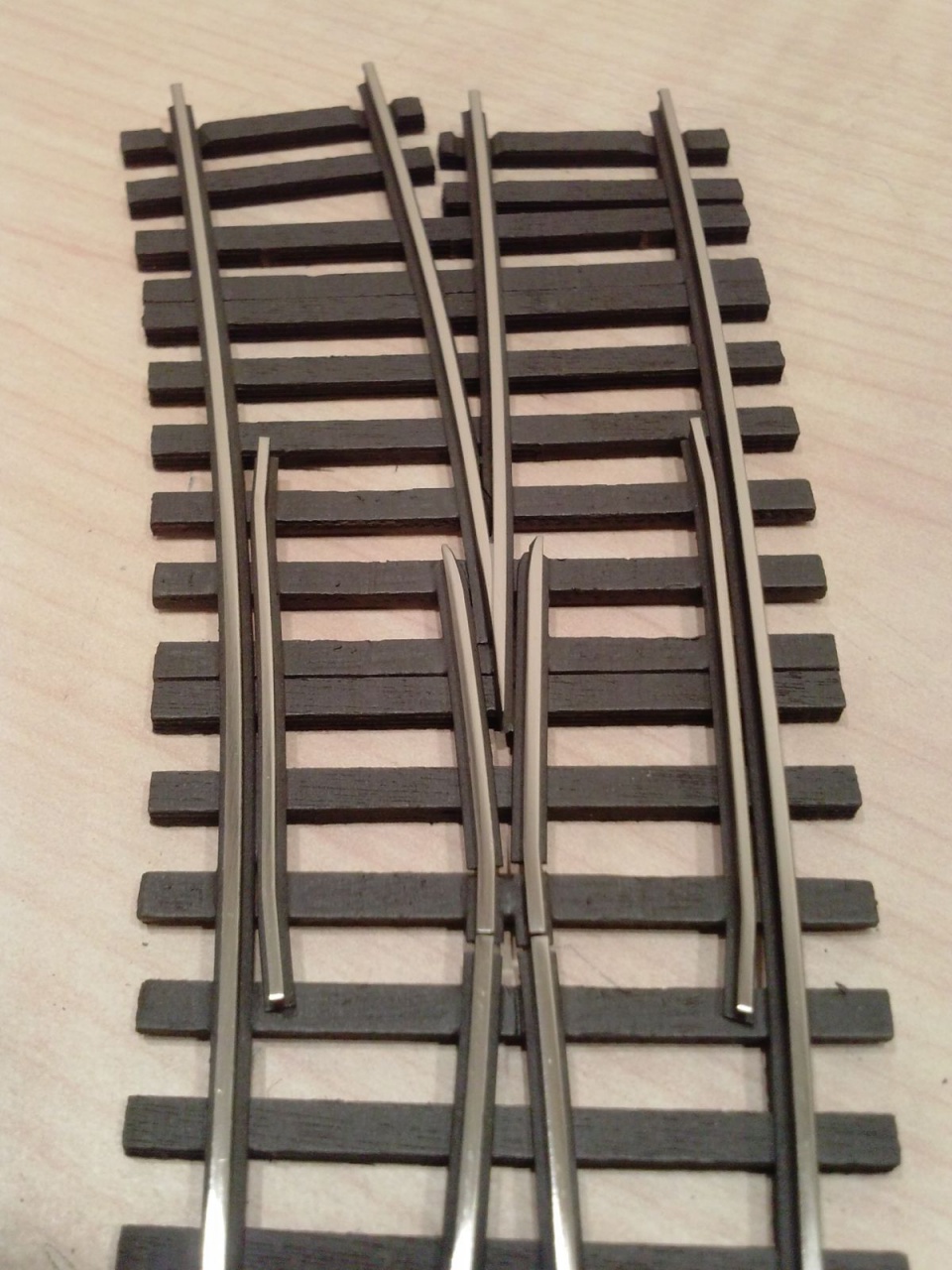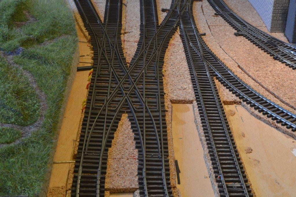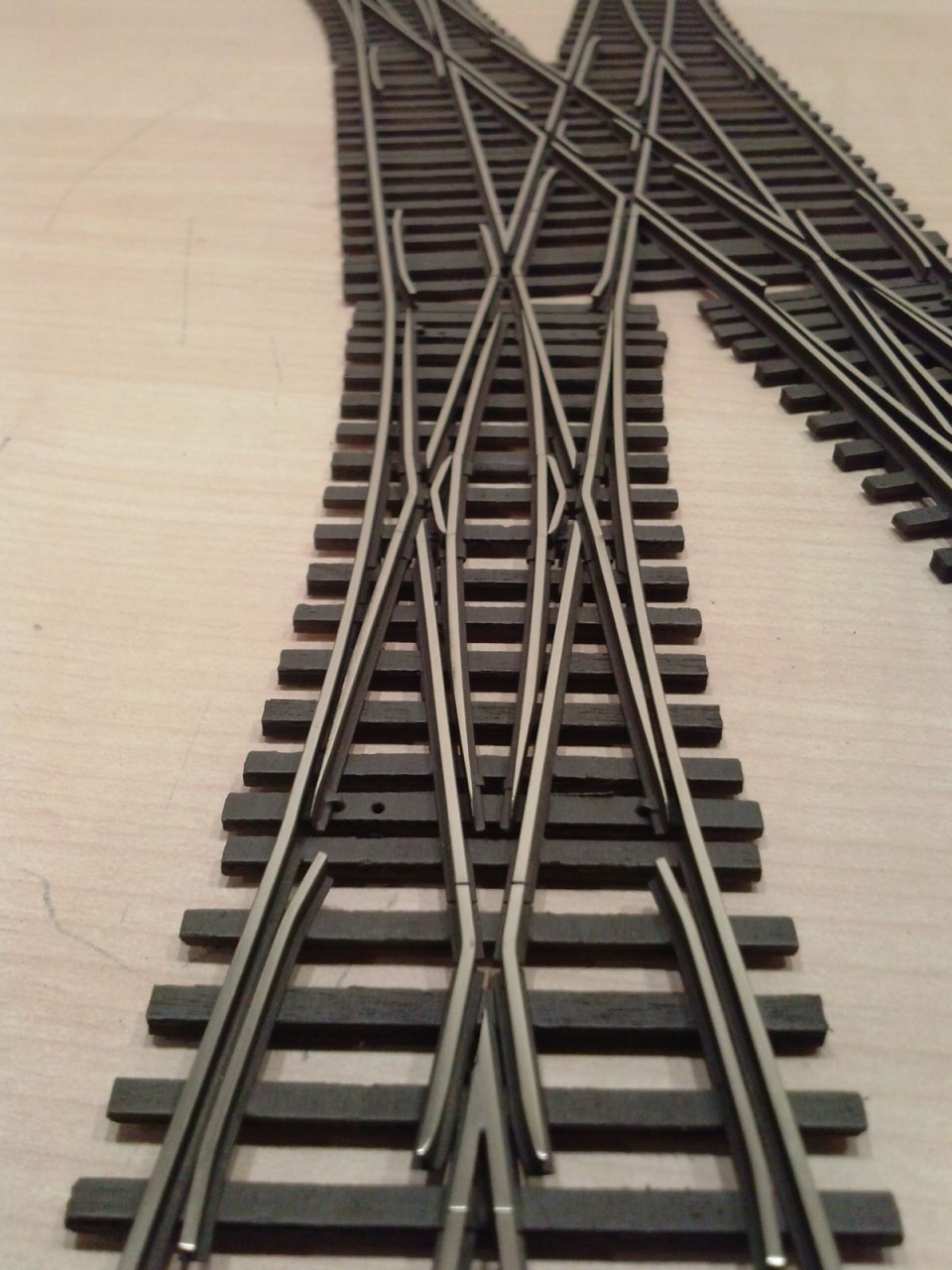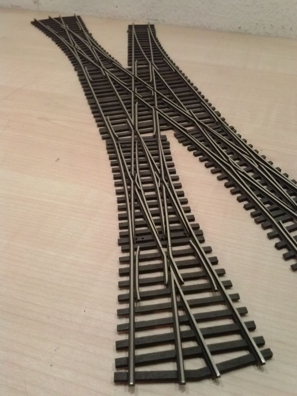 Egy TILLIG TT EW3 geometriájú kitérő egy 12 fokos angolváltóval kombinálva FREMO nyíltvonali (34mm) vágánytengely-távolsággal, és egy H0 méretű 24 fokos elágazás PECO geometria alapján. |