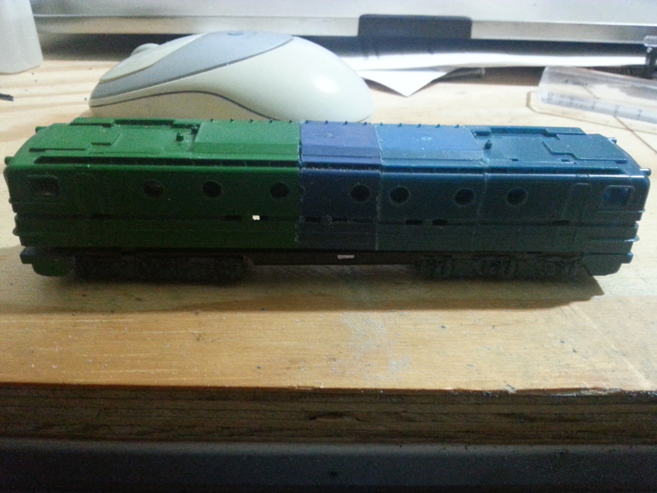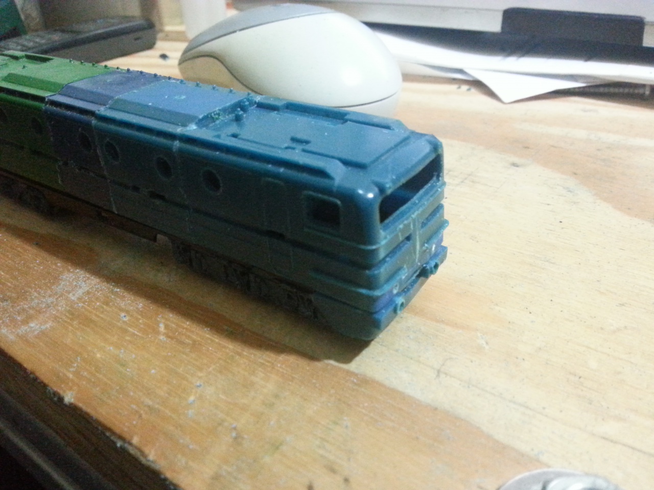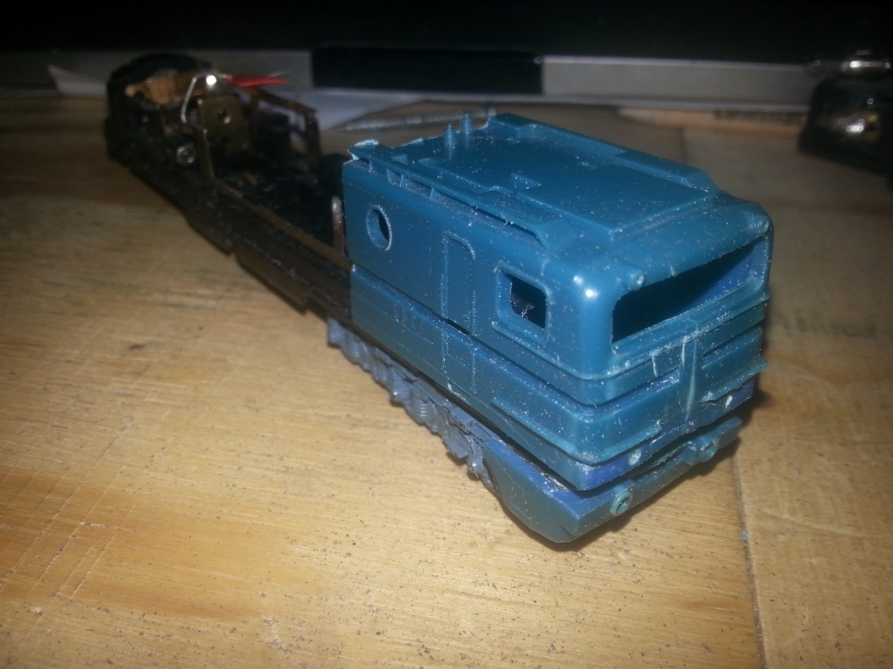 Igy fog majd kinézni festés után. ( most még nincs befestve, emiatt összerakva sem, mert csak festés után lehet). A motorok müködnek, de sajnos az elektronikára nincs hely. ( egy mozdonydekodérnyi hely van, csak nem mozdonydekoder kell, hanem olyan ami 6 (8) kimenetet tudna kapcsolni + némi külsö cucc.)