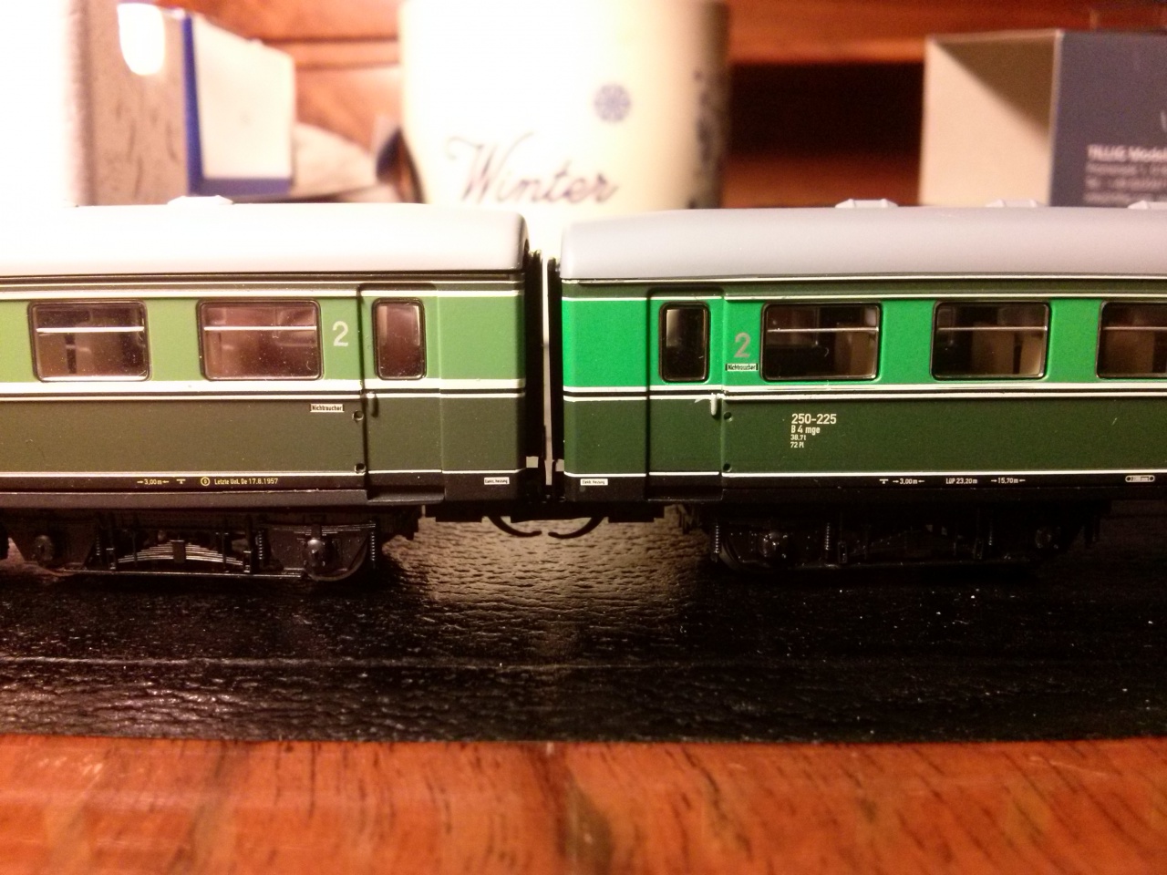 Pár évvel ezelőtt vásároltam egy 13881-es Tillig E5-ös személyvagont, így megörültem, amikor a tavaly megjelent a 13887-es Tillig E5-ös személykocsi. A képen a 13881-es a bal oldalon, a 13887-es pedig a jobb oldalon van. Az egy dolog hogy enyhén más a színük (vs. katalógusban levő kép), de jó pár eltérés is tapasztalható (tető színe, festett táblák elhelyezkedése).