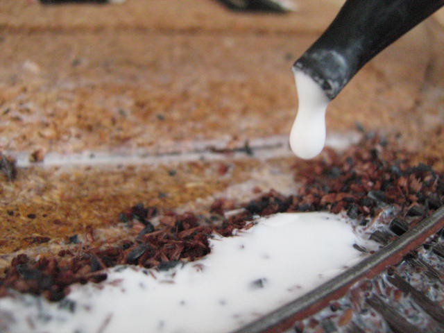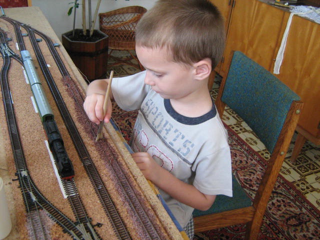 Most nézem, innen egy fontos lépés kimaradt! Le kell nedvesíteni az elegyengetett, de száraz ágyazatot! Ezt egy alkalmas spricnivel tehetjük meg. Ugyanis, ha szárazon kezdünk el csepegtetni, a felületi feszültség összerántja az elegyengetett ágyazatot. A nagyobbik fiam találmánya szerint a spricnibe szappanos víz került, igaza van, sokkal könnyebben terül a ragasztó így! |