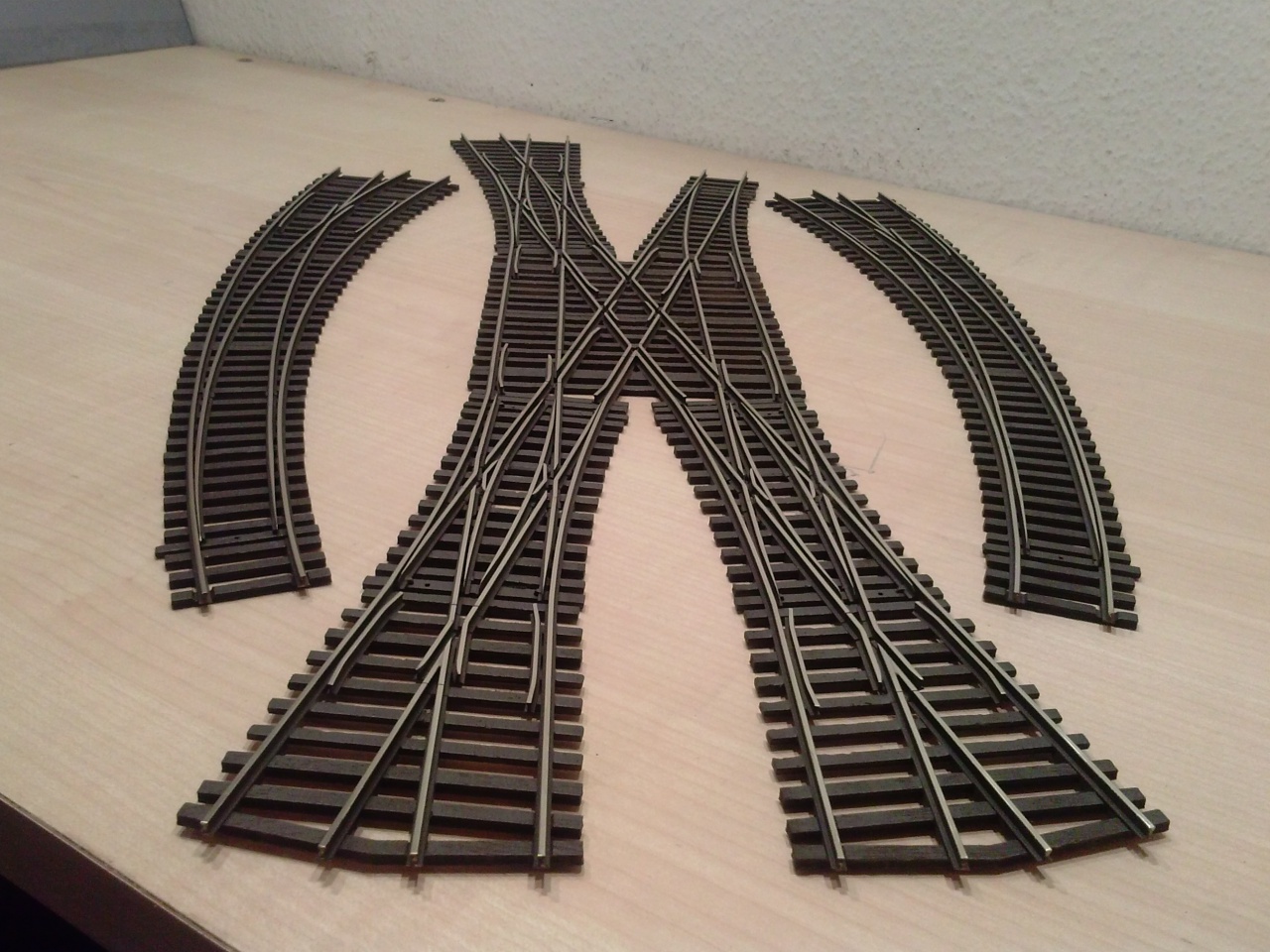 A teljes hossz 410mm, és 43mm a vágánytengely-távolság. Ez tk. 4db EW3 kitérő, csak a szívdarabok után egyenesen mennek az átszelésbe, nem fordulnak tovább 12 fokig, mint az EW3-as. |