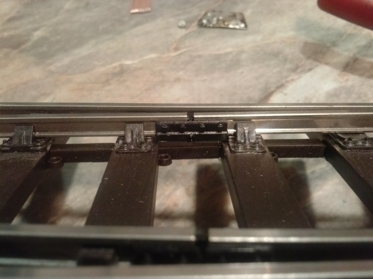 Egyszer (na jó, igazából többször) volt alkalmam egy 0e modulrendszeren egy állomást üzemeltetni, ahol a csúcssínek áramellátása az általad leírt módon volt megoldva. Sokat bajlódtam vele, elég, ha egy icipicit rosszabbul simul a tősínhez, és máris megáll rajta a mozdony. Nem jöttünk rá a hiba tényleges okára*, de szerencsére csak két vagy három kitérővel volt baj (az ötből).