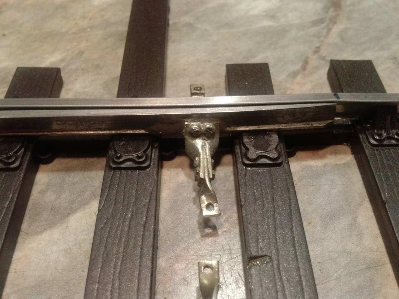 Már jó ideje nálam dekkol két darab kertivasút váltó. Át kellett alakítanom őket, mert gőzhajtásos üzemhez készültek, de modellezőtársunk elektromos hajtású mozdonyokat akar használni. Ráadásul a váltó keskeny nyomkarimás cuccokra lett kialakítva, így a használandó gördülőállomány zötyögött a sínkötéseken, mint öreg mozdony a 2,1mm-es sínen (ha H0-ban nézzük). Így sínkötést csiszoltam, vezetősínt keskenyítettem, sínt szabdaltam, forrasztottam, elektromos kapcsolatokat és szigeteléseket hoztam létre, de a legbüszkébb az állító rudazat átalakítására vagyok, melyben HOTotya is segítségemre volt (mint sok minden másban)! A gyökcsapok rögzítését is fémre cseréltem, részint a könnyebb mozgásért, részint a jobb vezetésért. |