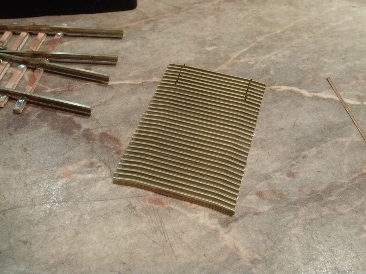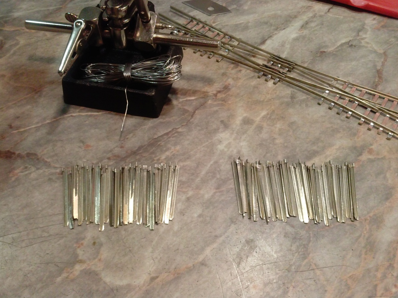 8 darab angolváltó, az testvérek között is 64 darab csúcssín! 16 sínpapucsot kellett feldarabolni, és egyenként ráforrasztgatni a sínvégekre! Na, ilyenkor jut eszembe a mondás, hogy a modellezés nem az idegbetegek sportja!  |