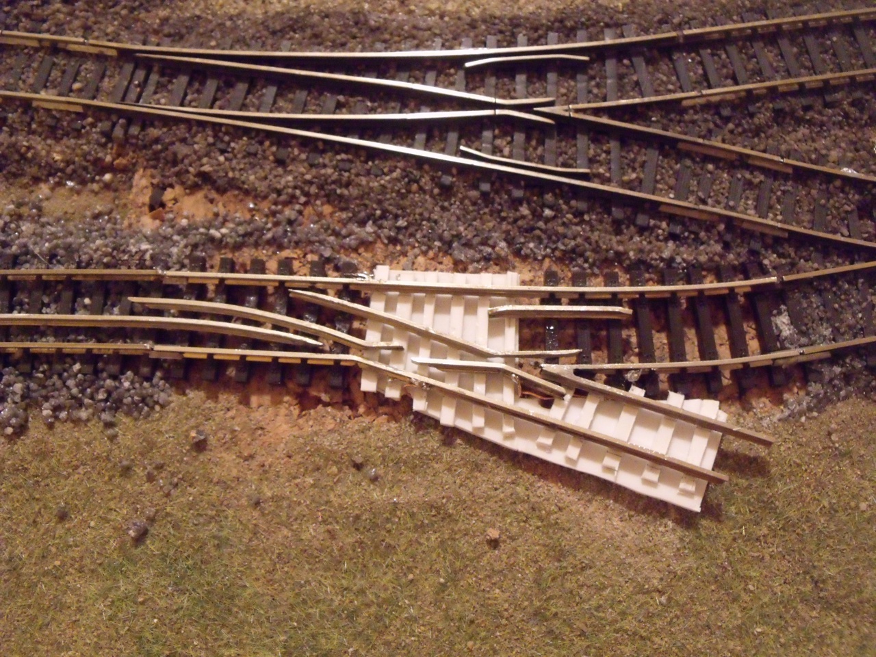 Ilyen lett a szétágazás... Az alap egy régi BTTB kitérő talpfarácsa annak minden hibájával, de merevségével és sugarával, ami nekem kell. Nem szép, de bízom a zúzottkőben  Most még csak kísérletezgetek. Beépítem az iparvágányba és meglátom hogy viselkednek rajta a "normál" szerelvények. |
