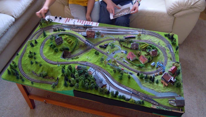 Még az első verzió a legjobb, habár abban van egy hurok, azt kezelni kell! Próbáld meg a kétvágányú fővonalat egy kicsit változatosabbá tenni, ne csak körbe menjen az asztal szélei mentén! |