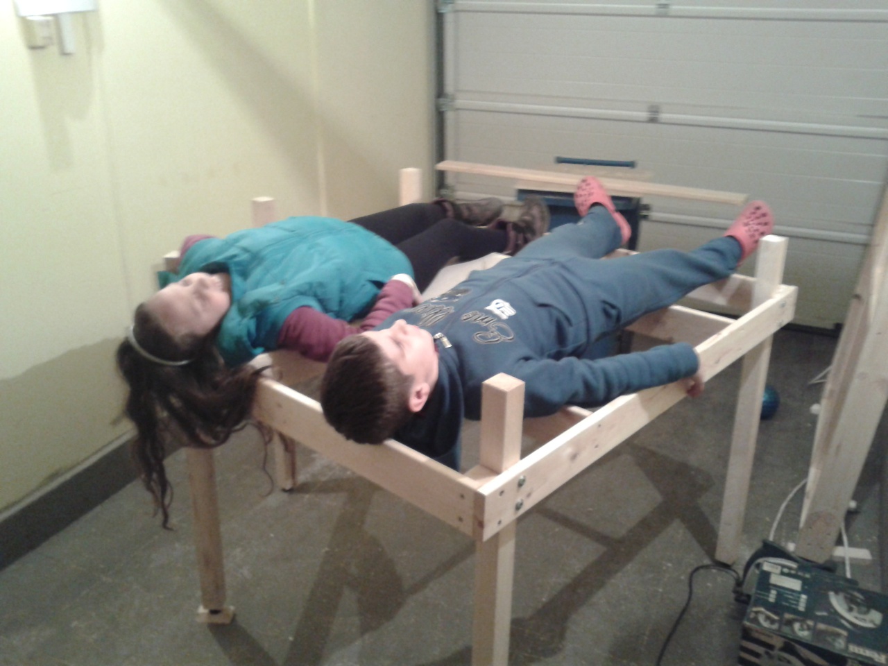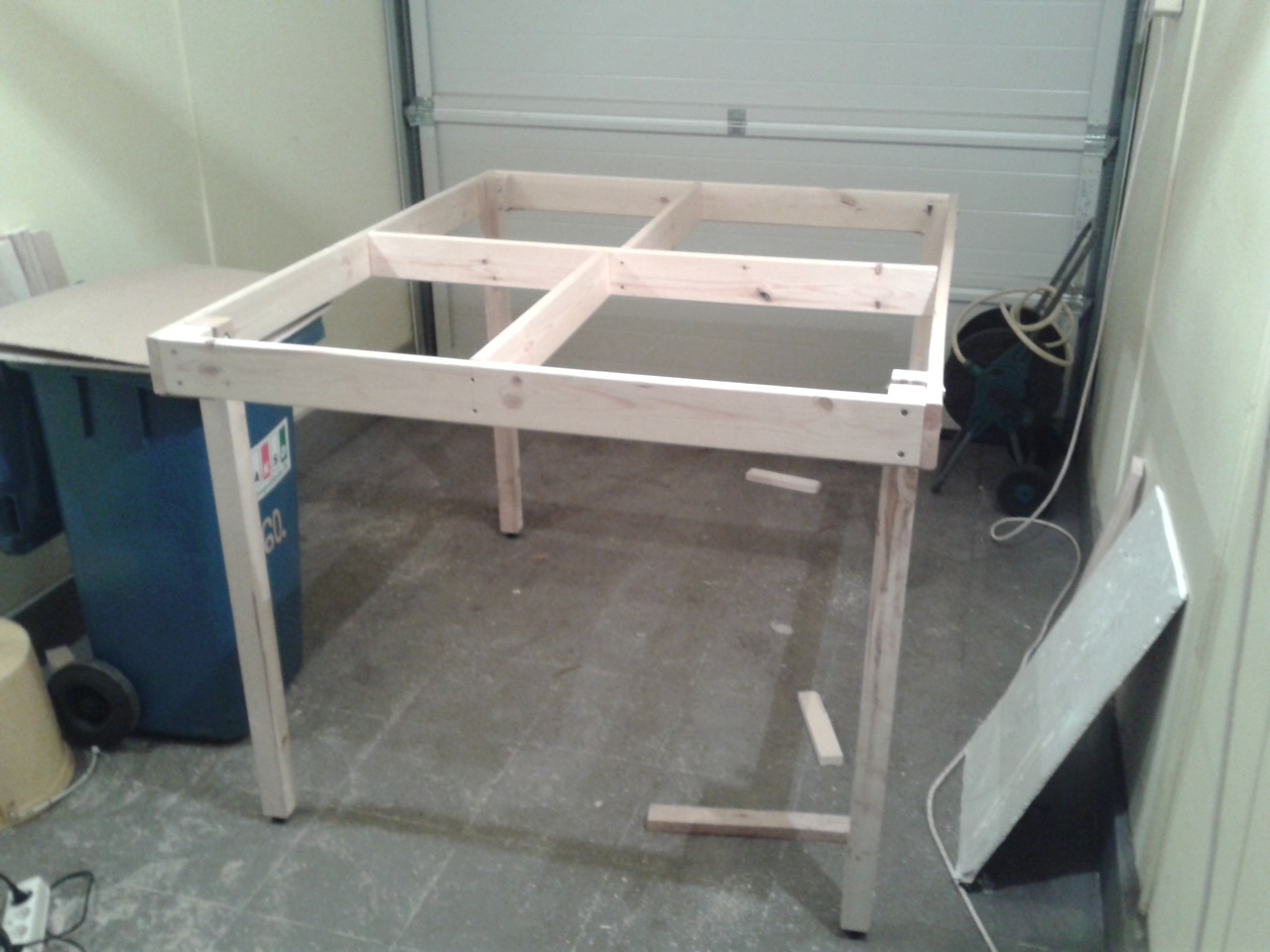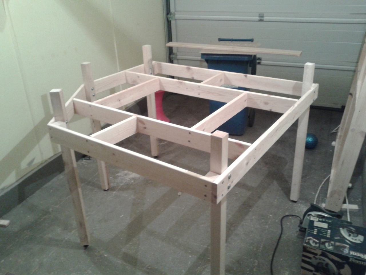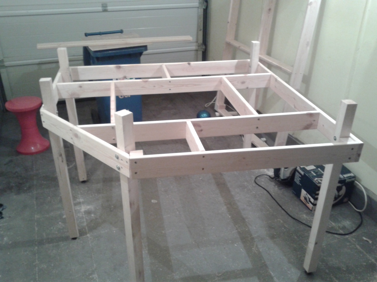 Én most kezdek egy asztalt, a keretet alu zártszelvényekből lett hegesztve és utána porszórva, ez bitang merev lett, majd rétegelt lemez lesz rátéve.