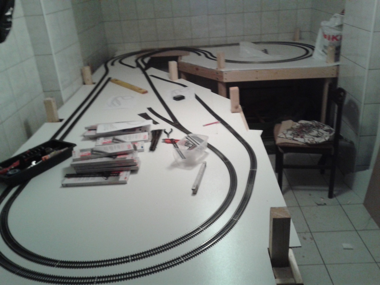 A képen az alsó szint pályája. Jelenleg csak egy bútorhátlap az ideiglenes alap. Azért keztem így összeállítani a pályát, hogy a végleges nyomvonalat még a fixálások előtt láthassam (így egyben nem is gondoltam volna milyen eltérések jelentkeztek). Az összeállított nyomvonal alá fogom következő lépésként a végleges alépítményt kivágni.
