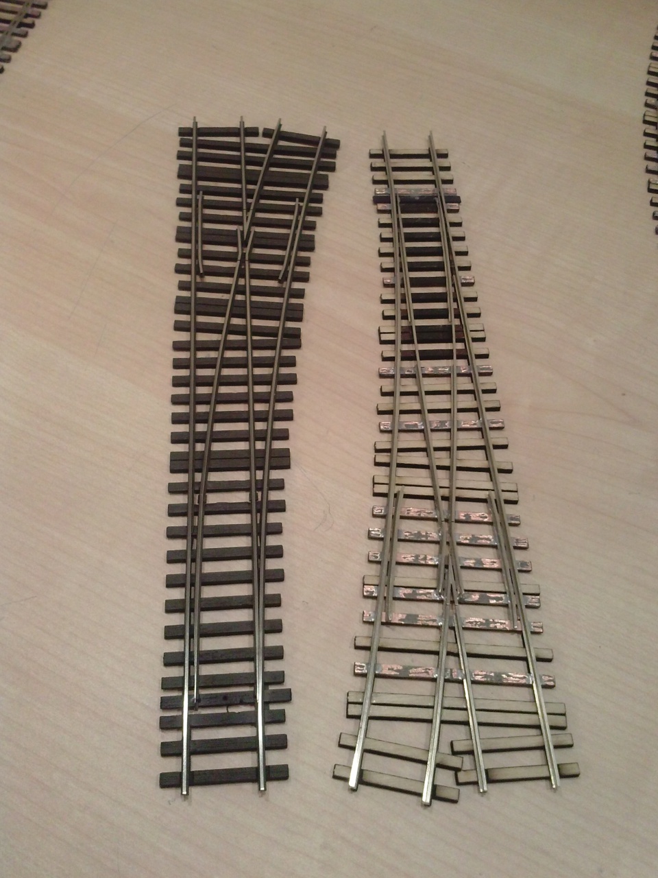 Két N-es íves váltó Peco Setrack R1 ív alapján 35mm-es eltolással CODE 55 profilból, és egy 24 fokos H0-H0e átszelés CODE 80 profilból. |