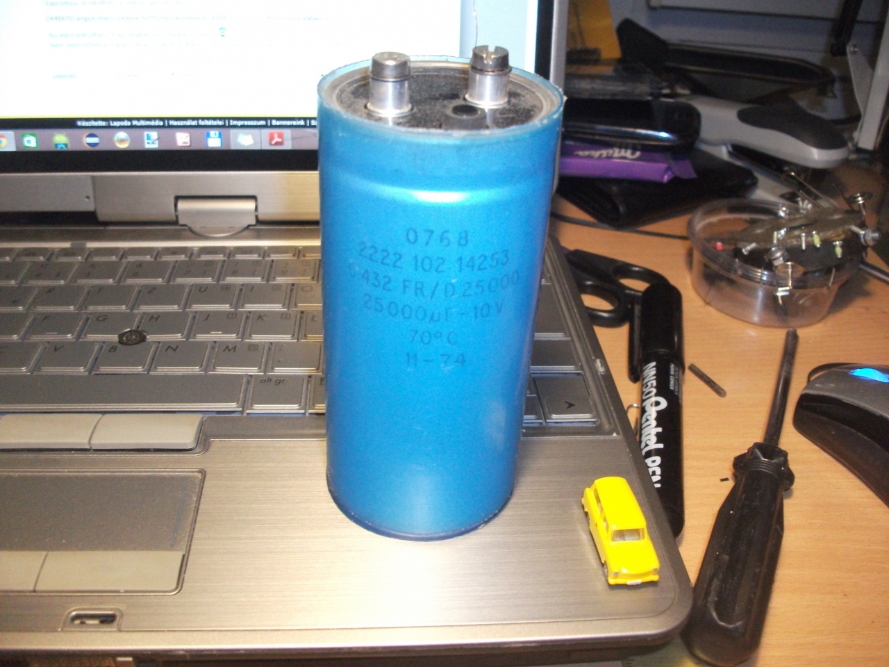 A töltést milyen kondival csináltad? Ha kicsi lenne, tudok kölcsönözni ilyet.  Egy bökkenője van, hogy max 10V-ot bír el...  De a 25000 uF talán elég lehet.  |