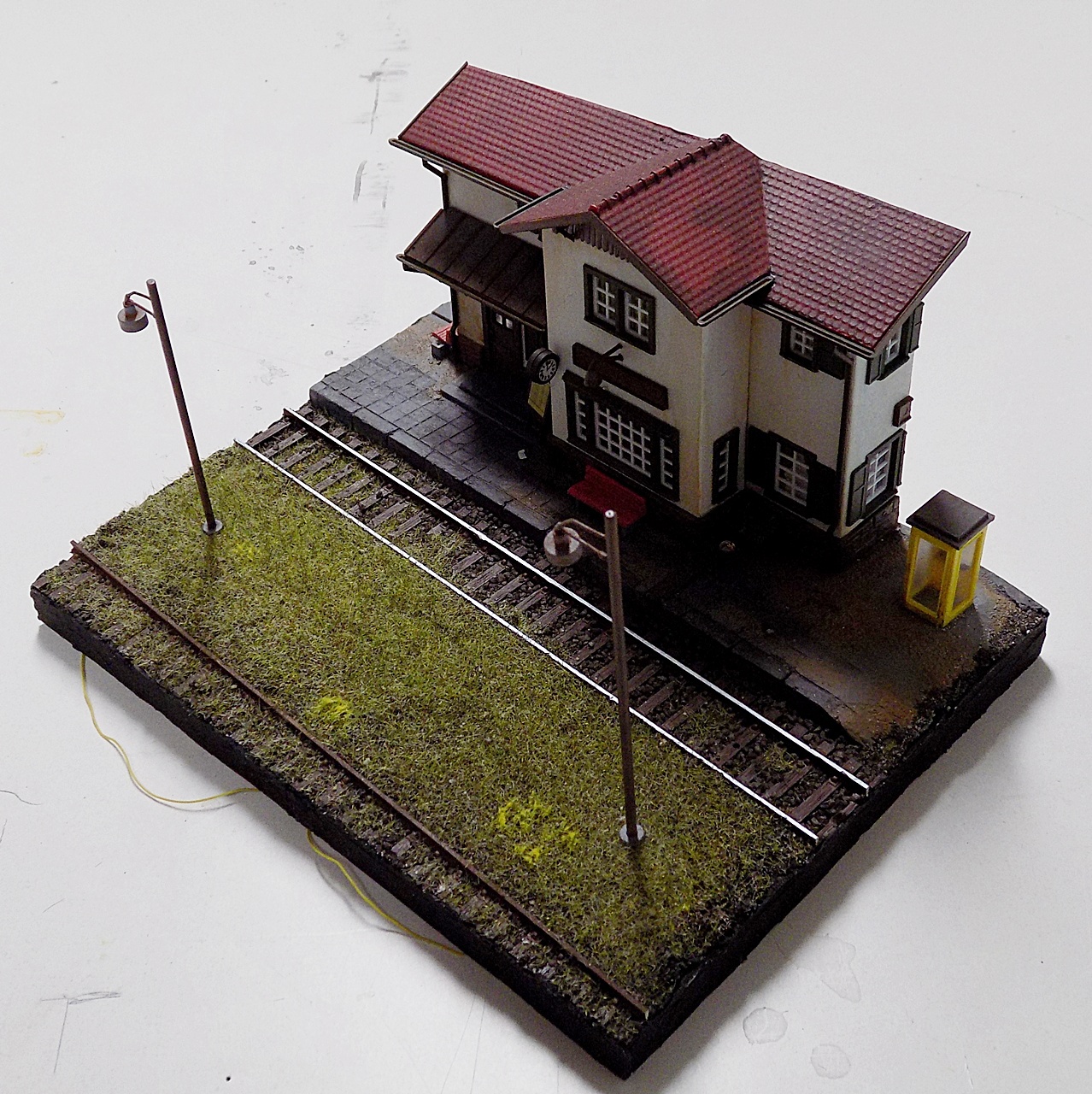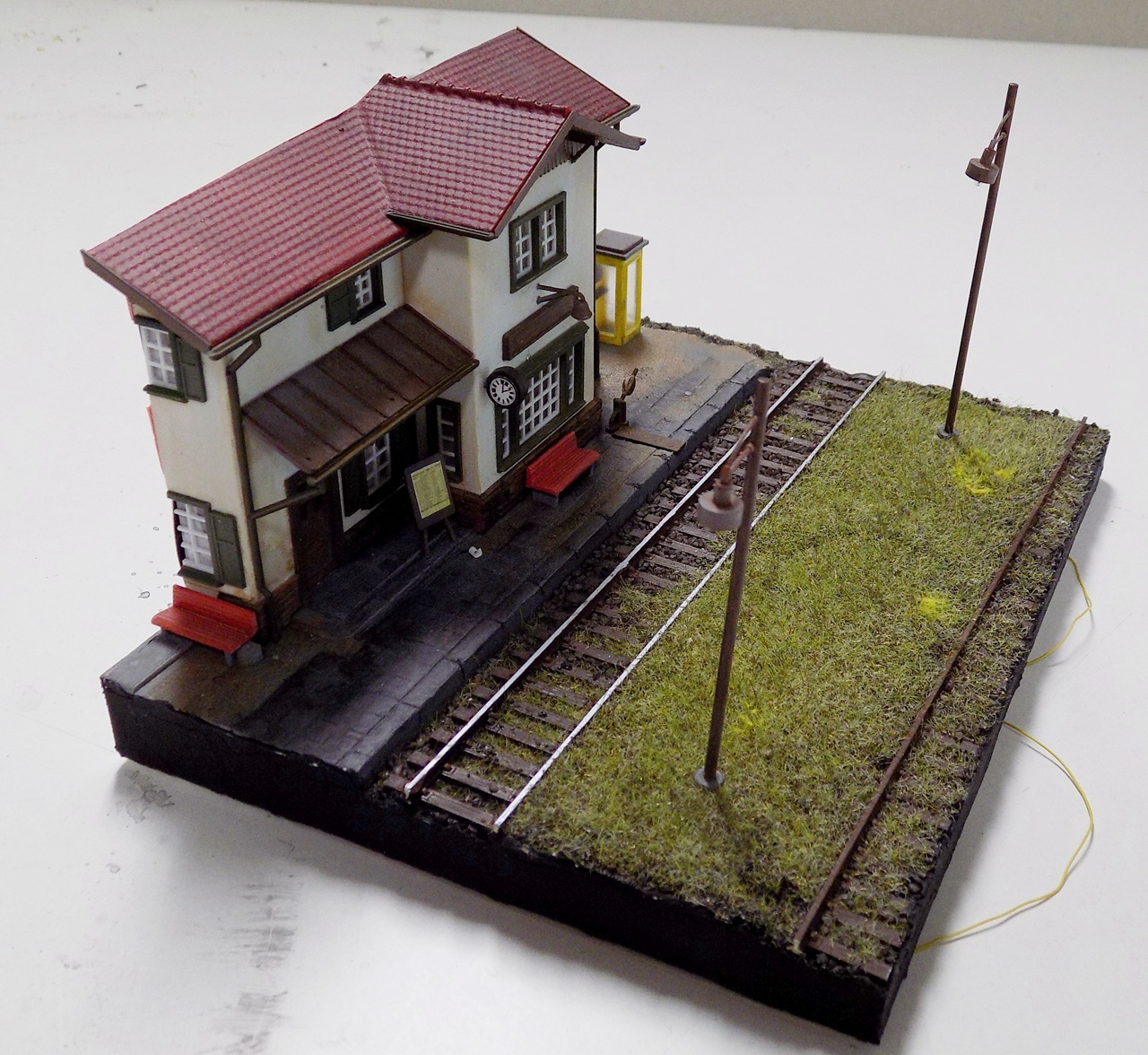 Egy keskenyebbet alulra (így befeküdt a sínszegek közé), és egy szélesebbet rá. Pillanatragasztóval összeragasztottam őket, majd festettem. Szépen mennek felette az őslelet mozdonyok is. H0-ás, és 2,5mm-es sínkorona magasságú a sín.