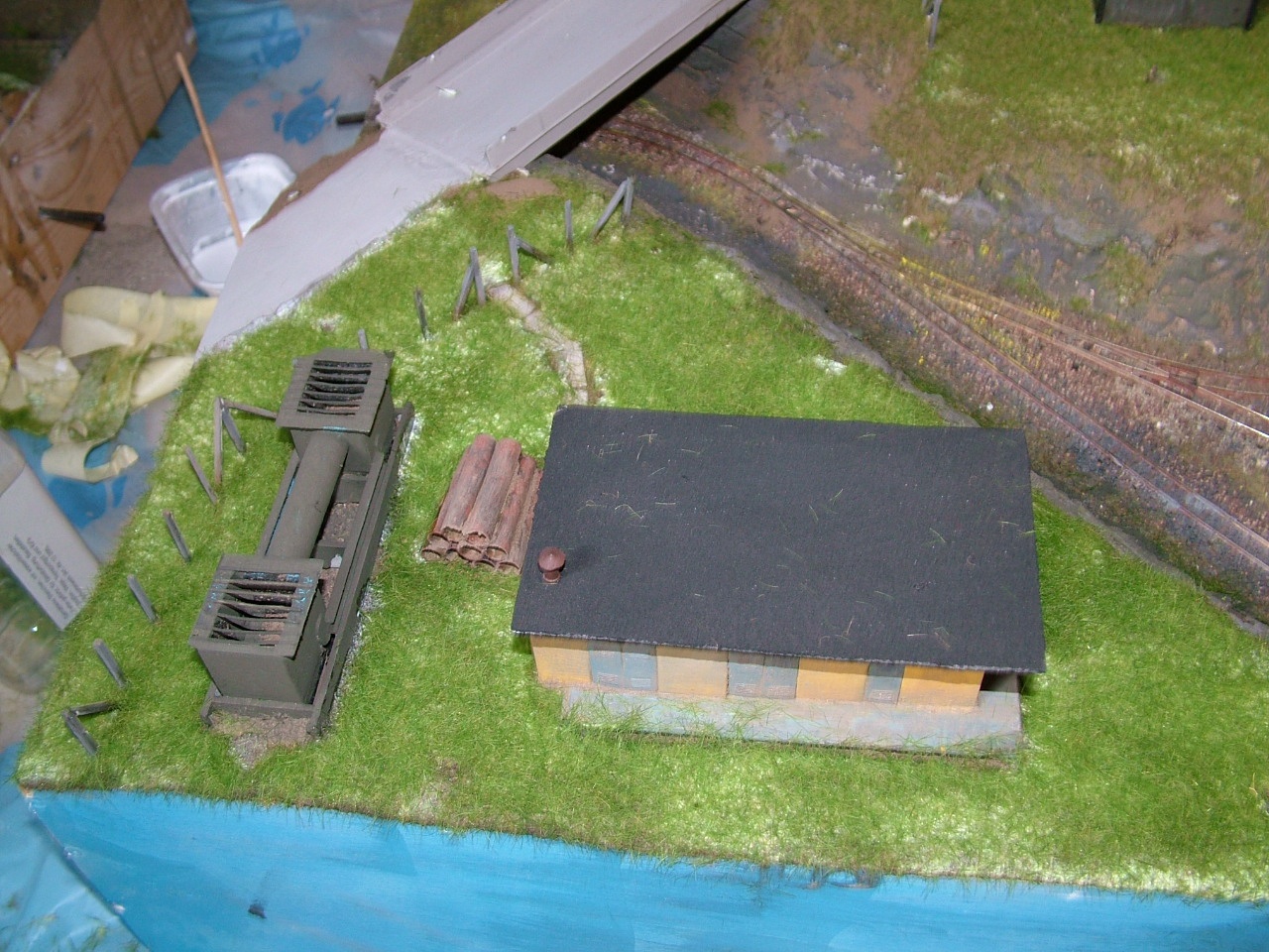 Kétféle vastagságú gyufaszálakból, keménypapírra ragasztva faragasztóval.A vastagabb gyufaszálból készültek a gerendák, a vékonyabból a deszkák.Jobb lett volna a lapos gyufaszál helyette, de még nem találtam olyat.Az oldalsó falaknál minden gyufaszálat ferdére kell vágni vagy reszelni felül ,hogy illeszkedjen a tetőgerendához, az egyenes falaknál vágás nélkül ragasztgattam egymás után a papírra a gyufákat, úgy hogy hol az egyik, hol a másik oldalra kerüljön a gyufa feje, és száradás után szikével egyenesre vágtam.Ennek a módszernek egy hátránya van, amire csak közben jöttem rá:ha nem zárt épületet készítesz, akkor látszik a papír belülről.Én viszont olyant terveztem, hogy fél épület zárt lesz, a másik felén viszont a hosszabbik oldalon nyitott...Ha kész a fal, akkor le síkba kell csiszolni a gyufaszálakat az oldalakon, én ezt egy tűreszelőt hántolónak használva csináltam, ill. csiszolópapírt.