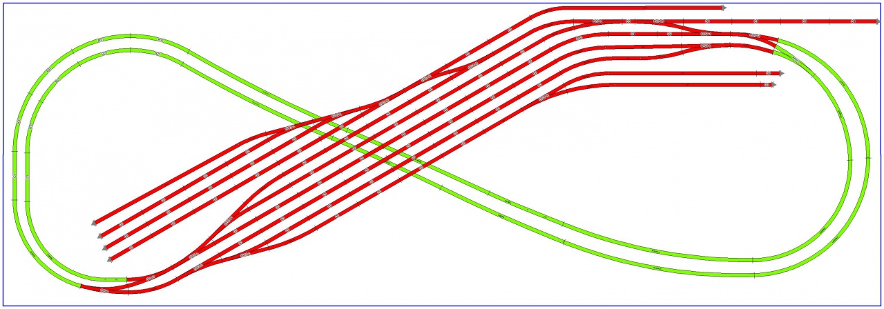 Beraktam a védő csonkákat ahogy javasoltad. Az átvezetést másképp oldottam meg mert ha még íves váltókat rakok be a két oldalra akkor tovább kellene növelni az asztal hosszát. Most viszont az lenne jó tudni hogy a zöld szakasz elég-e arra hogy emelkedjen illetve süllyedjen a vágány. Meg még az is kérdés hogy az egészet leszeretném fedni mármint a felső szintre gondolok. De lehet hogy csak úgy kellene ahol a piros vágányok vannak illetve egy kicsit szélesebben. Ezt most jól megaszontam megint  |