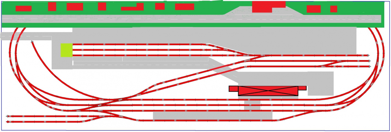 Viszont kérdezem, ha van egy icipici hely még szélességben, akkor esetleg a jobb felső csonka vágányok elhagyásával nem lehetne - bal alsó csonkából - egy mellékvonalat ívben felvezetni egy 1 - 2 vágányos kisállomáshoz, ami a pálya tetején helyezkedik el emelt szinten?