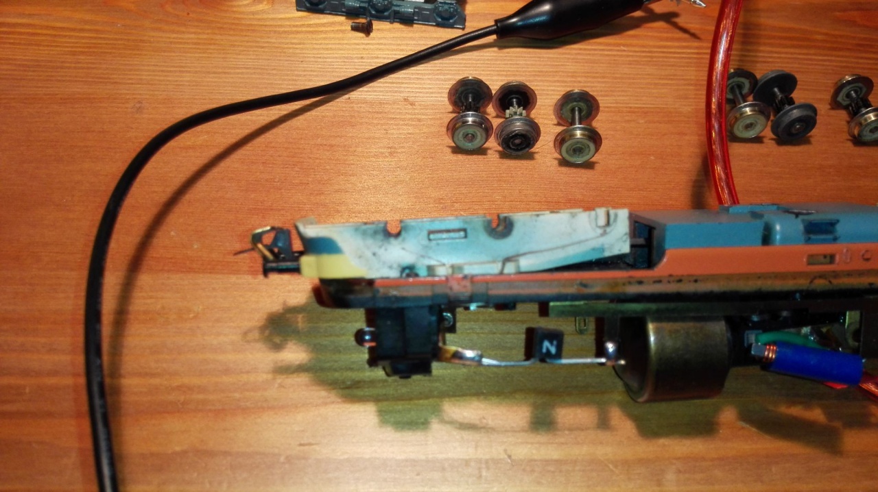 Tegnap este újra szétszedtem az egész gépet - most a forgóvázakat is kiszedtem és úgy néz ki meglett a "bűnös": a forgóváz és a keret közti kontakt nem volt tökéletes, szerintem egyszerűen "lelapultak" a réz érintkezők. Kitisztítottam, összeraktam és az áramszedés meseszép lett!