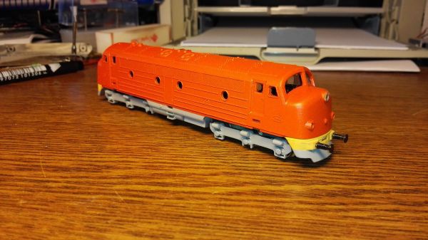 Azóta már kiderült,hogy alapozás után az alvázkeret frontjaival kellett volna nyitni,sárga alappal,utána következeik az oldalsó pirosok festése,ezek után jött volna rá a fekete csíkozás + a járdák feketéje kitakarva és csak a legvégén kellett volna a mozdonysátor zöldjét fújni.