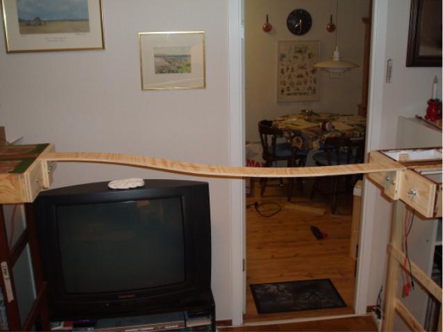 Hosszúsínszállító szerelvényen ritkán szoktak 1-2 szál sínt szállítani, ahhoz túl drága a közlekedtetése. 6-8-10 szállal már valószínűbb (a maximális terhelhetőség egyébként sínrendszertől (folyómétersúlytól) függ, 20-28 szál a maximum, ha jól emlékszem). Fogj meg hat szál méteres sínt (az TT-ben pont egy 120 méteres hosszúsínnek felel meg), 3-4 ponton rögzítsd őket egymáshoz valamivel, majd kezdd el óvatosan hajlítani. Meg fogsz lepődni, mekkora oldalirányú erőt kell kifejteni, hogy meghajoljanak. |