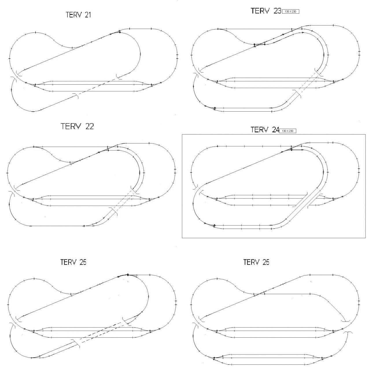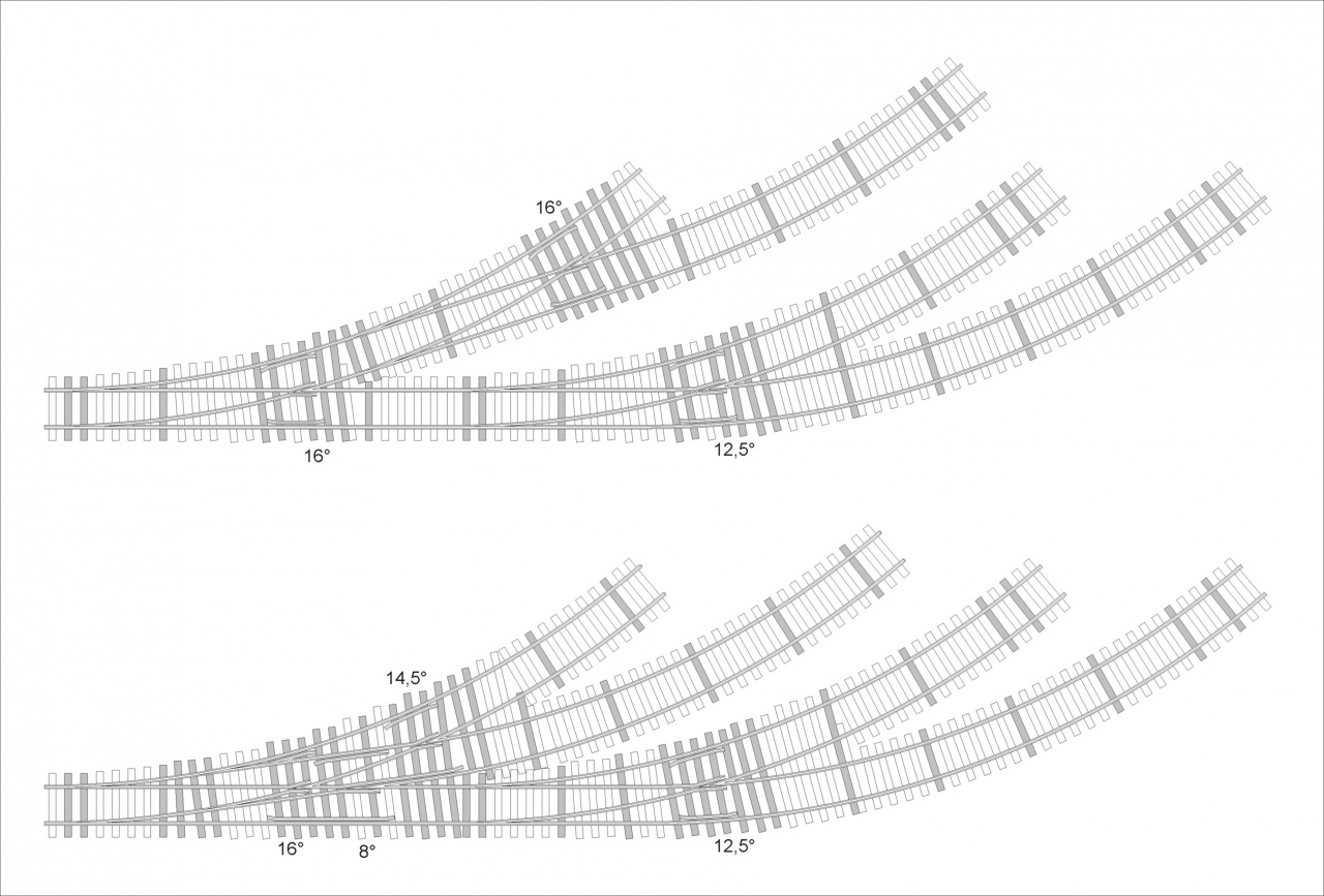 Az állomás 4 vágánnyal 40,7 fokra áll keresztben. Ennek a két líráját rajzoltam meg először. Hátra kerül a felső és előre a látványosabb alsó. Lehetne mind a kettő egyforma, de a felső túl egyszerű, viszont annyira nem vagyok mazochista, hogy mindkét oldalra a bonyolultabbat építsem meg, így kétféle váltókörzet lesz.