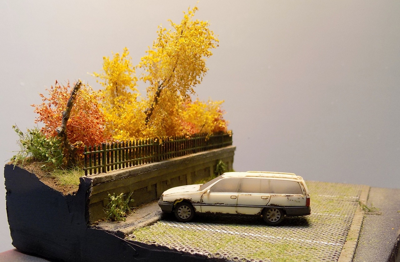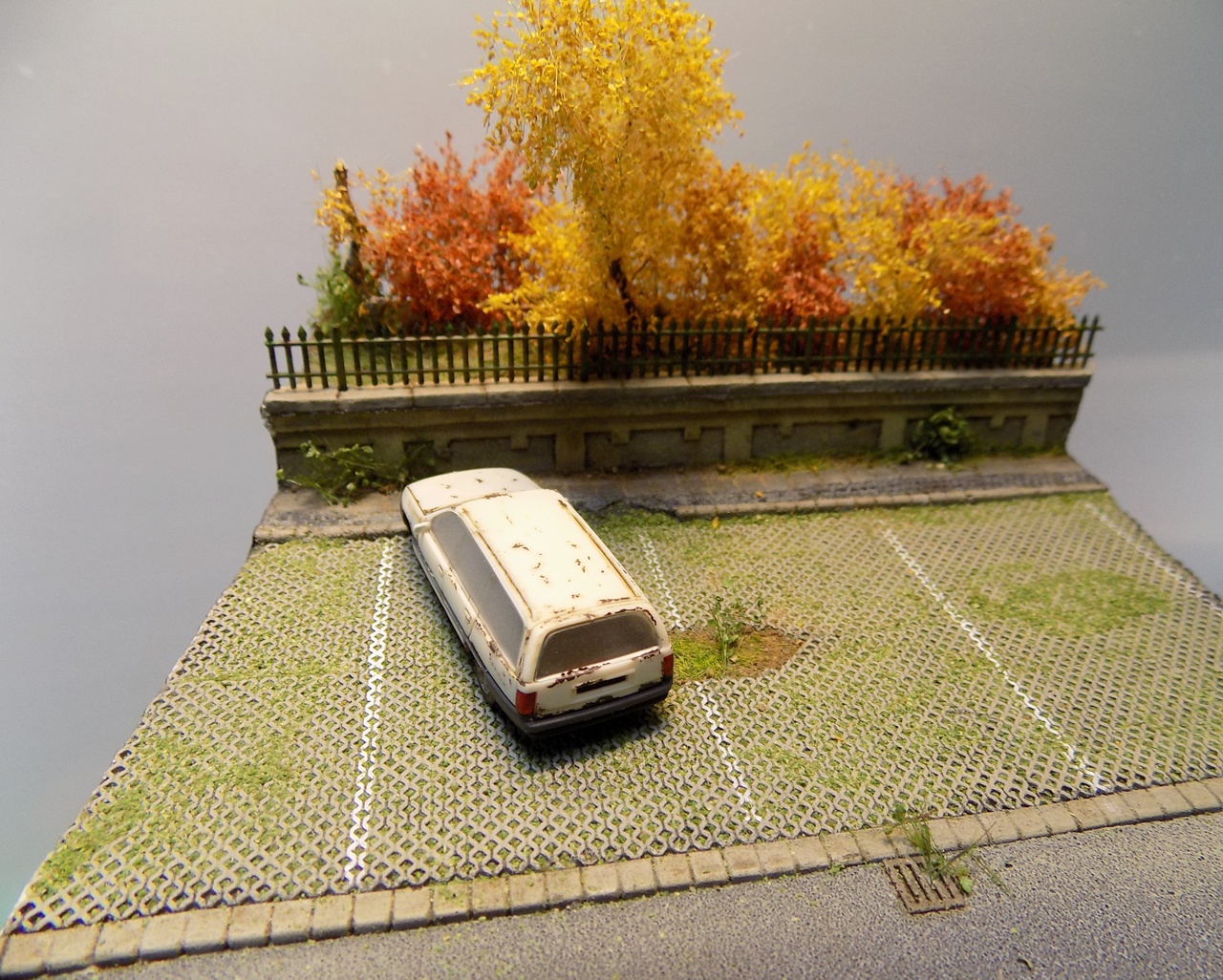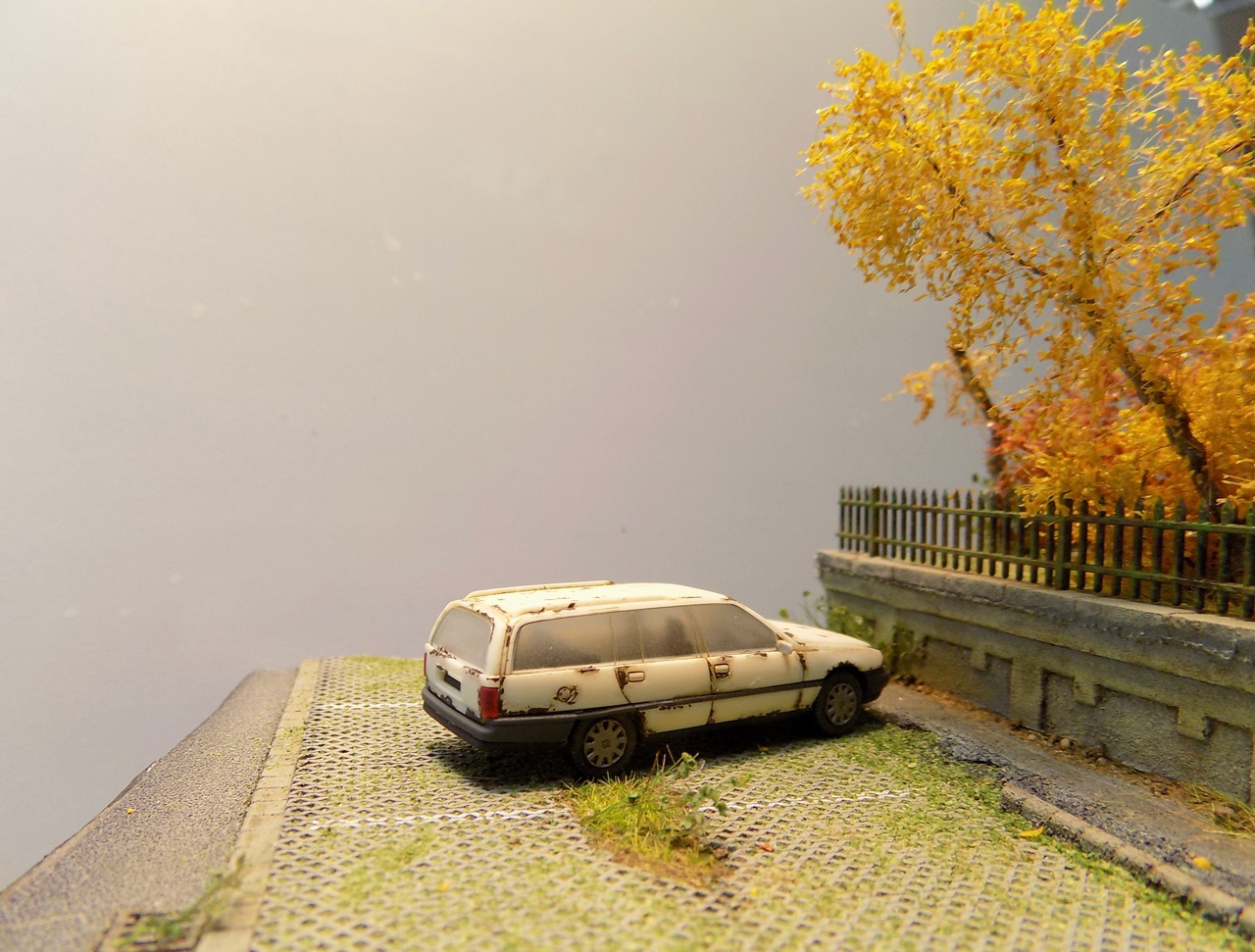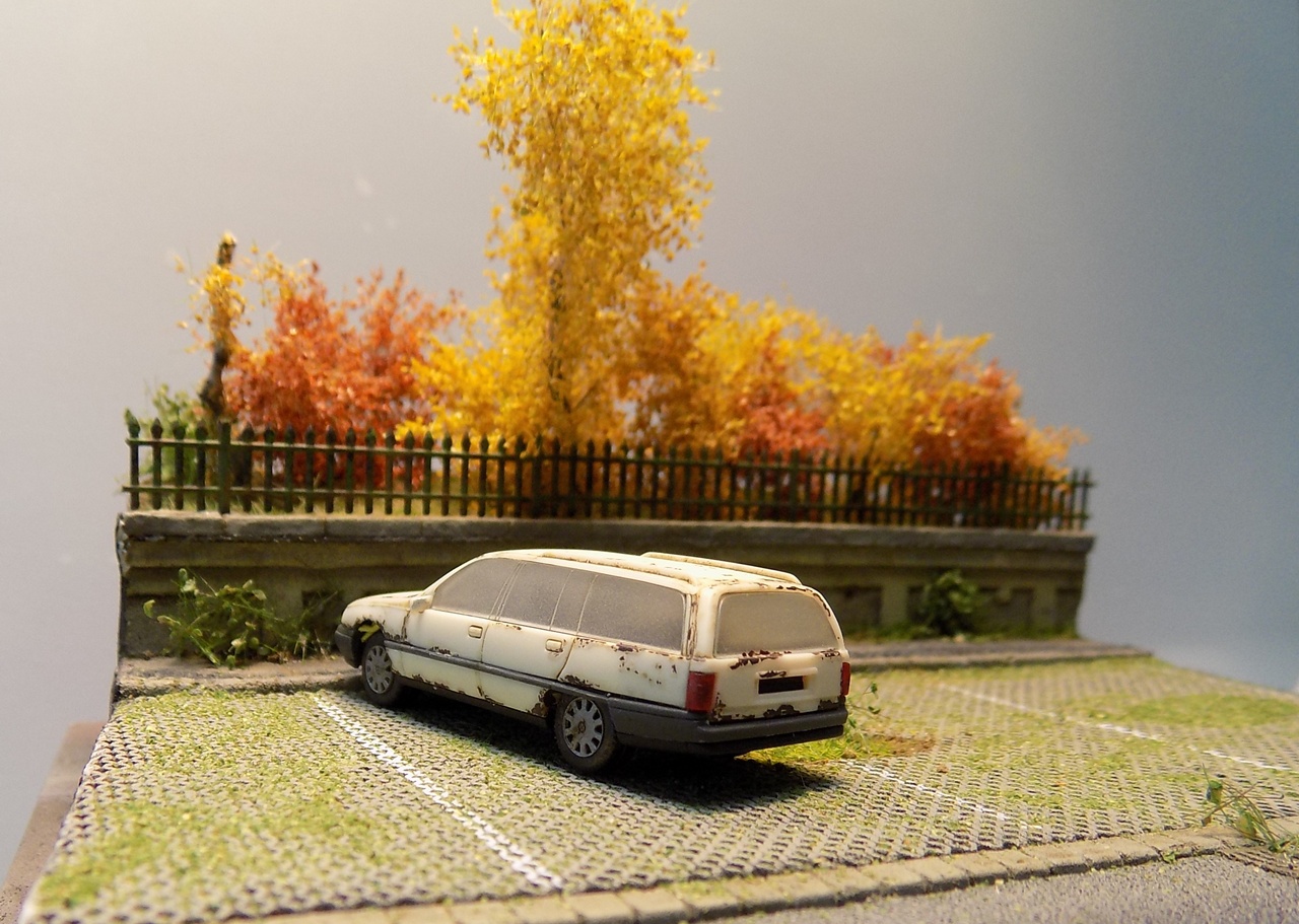 Az úgy volt hogy kellett valami a parkolóba, és ezt a gépjárművet találtam megfelelőnek, hogy összebarmoljam. Egy baj volt csak vele. Előttem már valaki szerelt bele világítást, ezzel egy időben pedig az egész műszerfalat összekaszabolta, majd mint aki jól végezte dolgát össze is ragasztotta a kasznit az alvázzal. Mivel szétszedni nem tudtam, az ablakokat meg nem volt kedvem maszkolgatni egyben kapott matt lakkot. De jobb is, mert a belseje nem volt valami szép. Így meg olyan mint mintha párás volna belülről...vagy deres kívülről. Kinek kinek ízlése szerint  Na ezért maradt ott az a darab drót. |