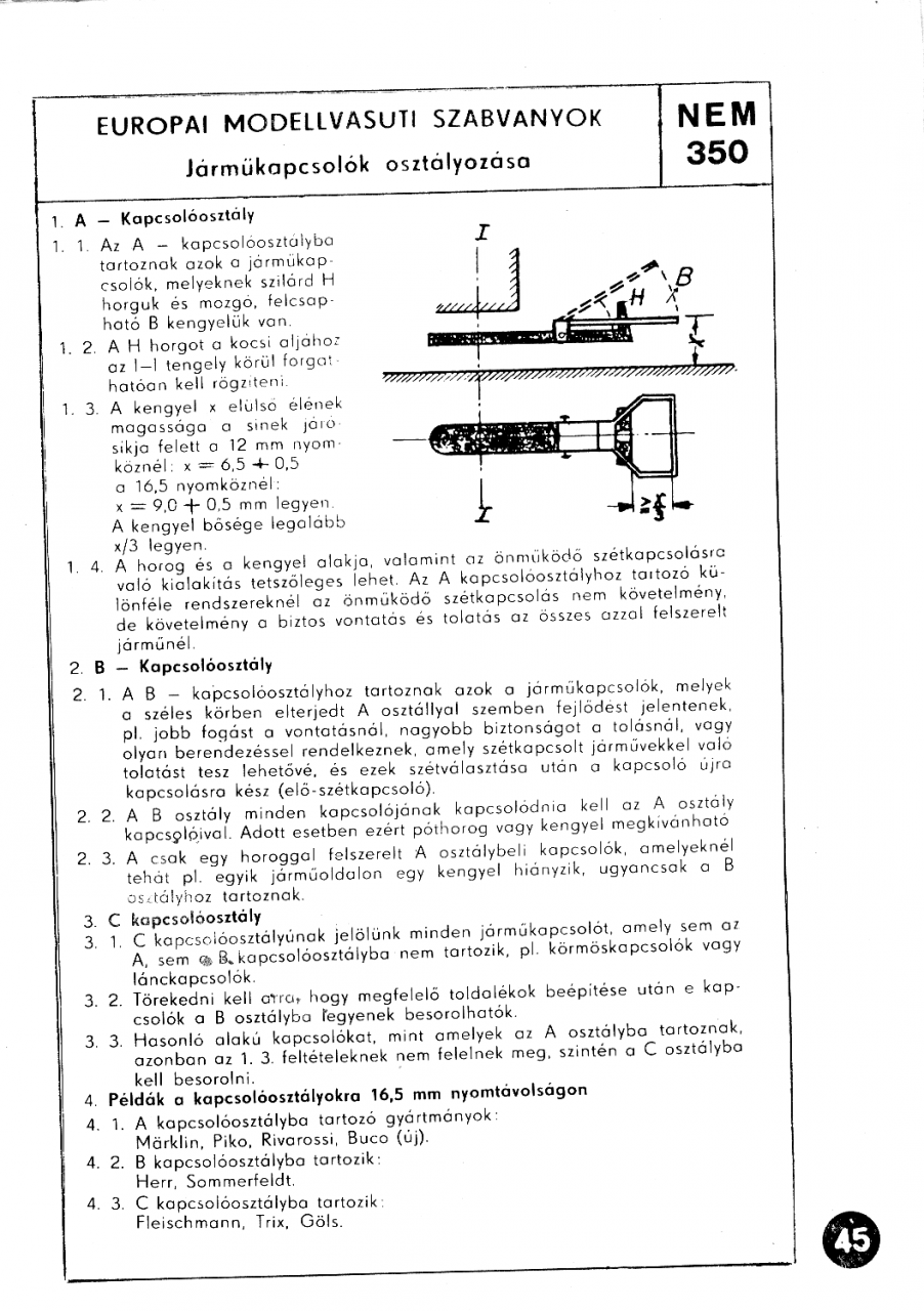 Egy 1970-es kiadású Európai modellvasút szabványok füzet szerint (NEM 350) 1. 3: A kengyel x elülső élének magassága a sínek járósíkja felett a 12mm nyomköznél x=6,5+-0,5mm (...) legyen. A kengyel bősége legalább x/3 legyen. (A szkennelés minőségéért elnézést kérek, nem akartam már nagyon zörögni az asztal pakolásával  ) |