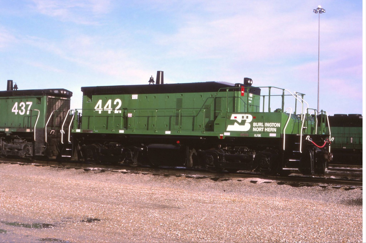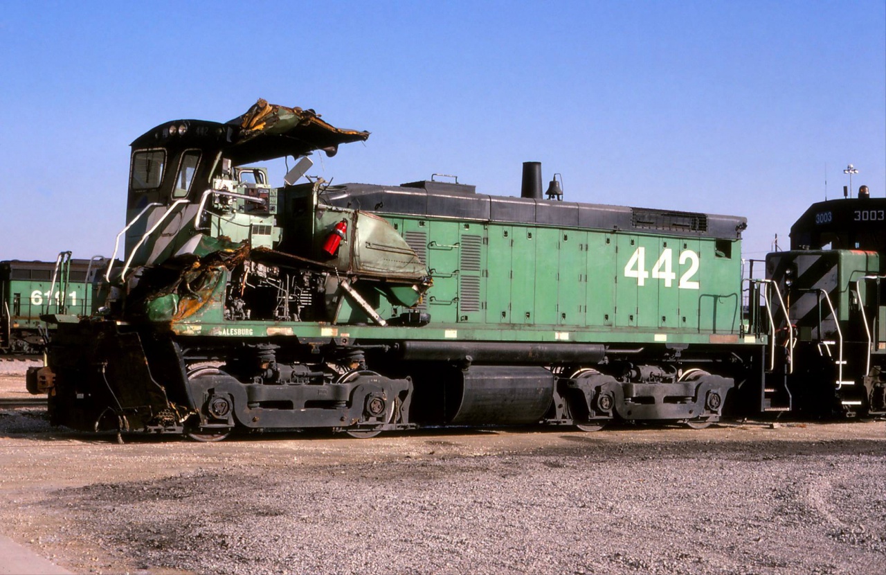Találtam két képet a Burlington Northern EMD SW1000 BN 442 gépről, 1986 -os balesete után nem hagyták veszendőbe menni. A vezérállás helyén mintha pót üzemanyagtartály lenne?? Itt egy harmadik kép, üzemelés közben. |