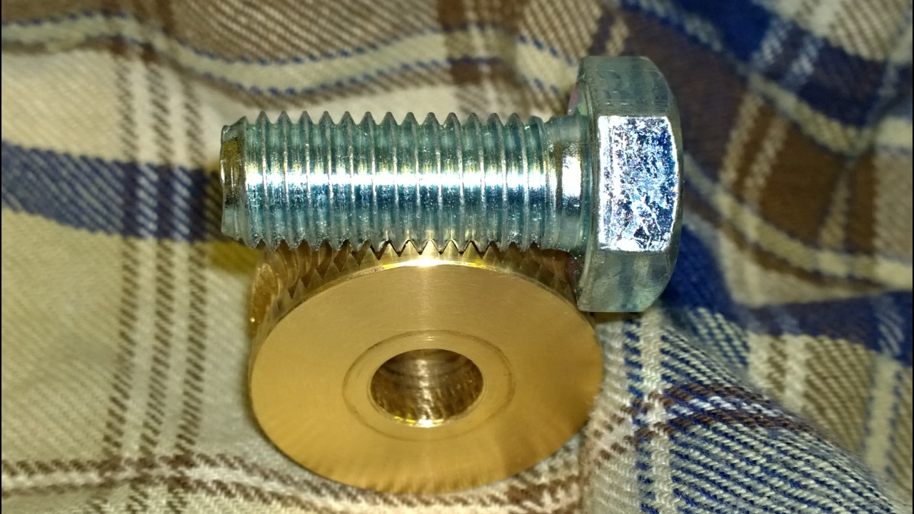 A másik dolog, ami itt nem müködik, hogy a csigának azonos átméröjünek kell lennie mint a menetfuro, azaz ha M8-s mentevágoval csinálod a kereket, akkor a csigának egy M8-s csavar kell, addig a csigahajtáshoz a csiga átméröje csak másodlagos kérdés - egy M0,5-s csigakerékhez csatlakoztathatsz egy 5 mm átméröjü csigát, de akár egy 10-15mm átméröjüt is. |