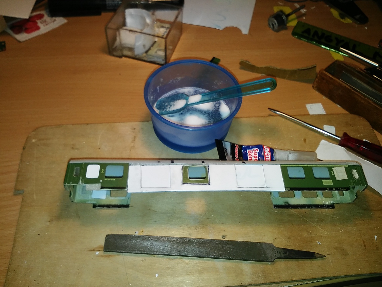 Találtam itthon egy kis vékony falemez-félét, ami szerintem egészen jól mutat az Rgs kocsin. Leragasztva még nincs, mert nem tudom mi fogja meg jól a fát és a műanyagot is. Esetleg valaki tud ilyen ragasztót ajánlani?