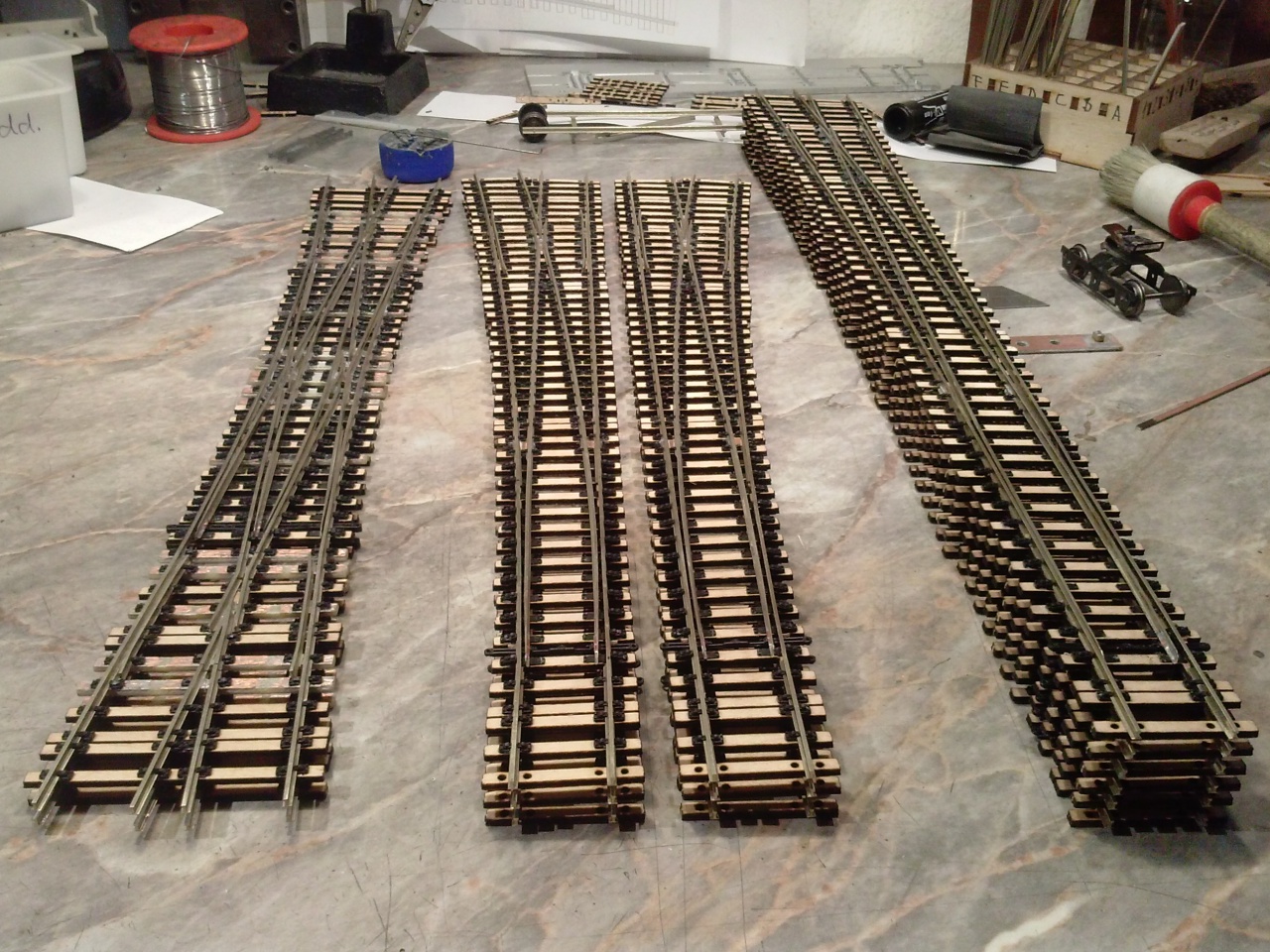 Befestettem az első példányt a tűzőgépkapcsos H0e váltóból, és elkezdtem építeni 11 hasonlót de ezeket CODE 70 és 80-as profilokból. A tűzőgépkapocs nem vált be igazán, úgyhogy 0,3x0,8mm-es réz csíkokból hajlítottam hozzá kapcsokat. |