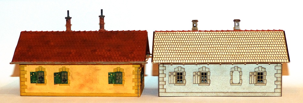 A fotón a fejlődés különböző fázisai láthatók. A festett már majdnem hibátlan. A tetőn van még mit igazítani. A 0,5-ös kartonra ragasztott 0,3-as kartonból vágott cserép együtt sem kellően merev. Ami merevítés a műanyag tető alatt bőven elég, az ide kevés.